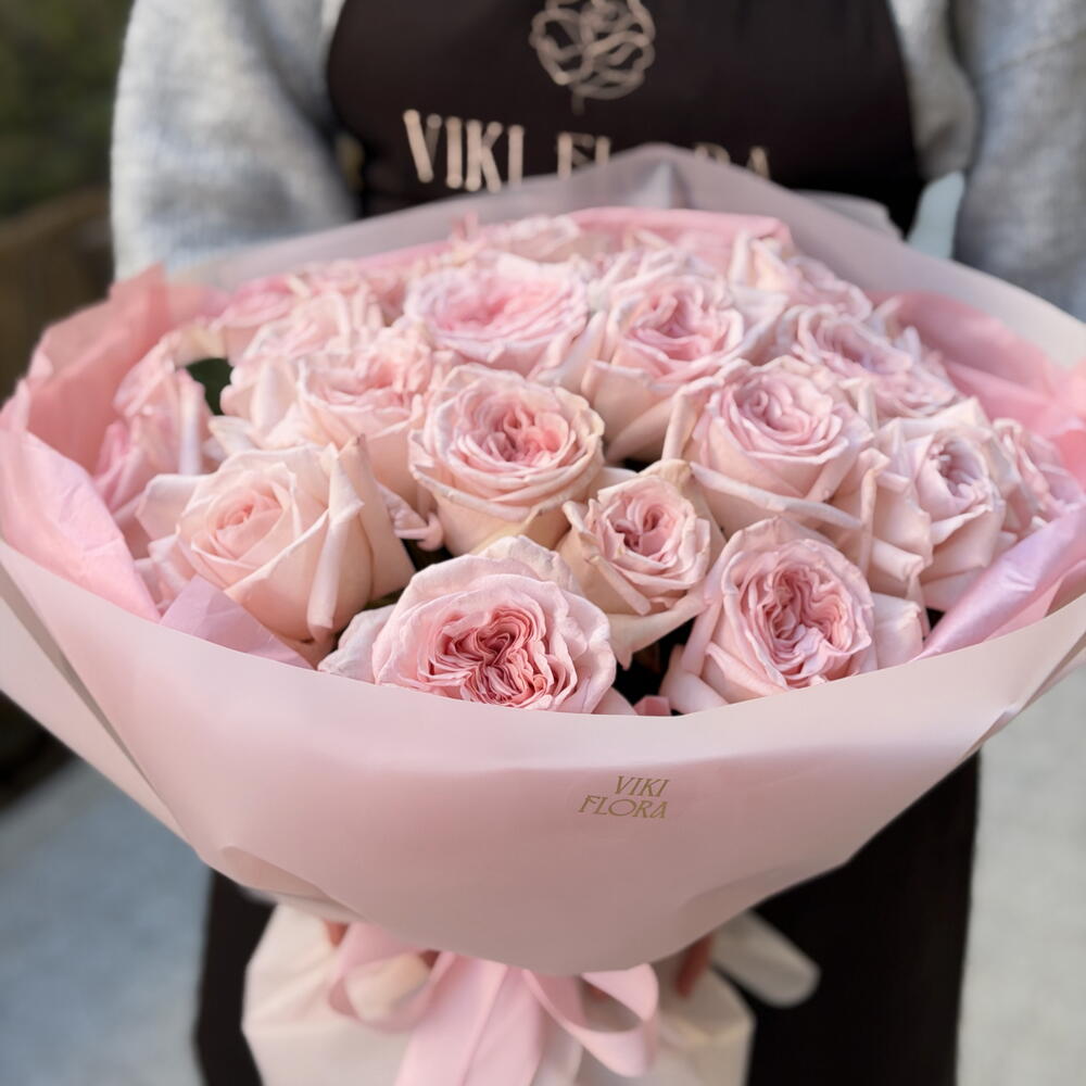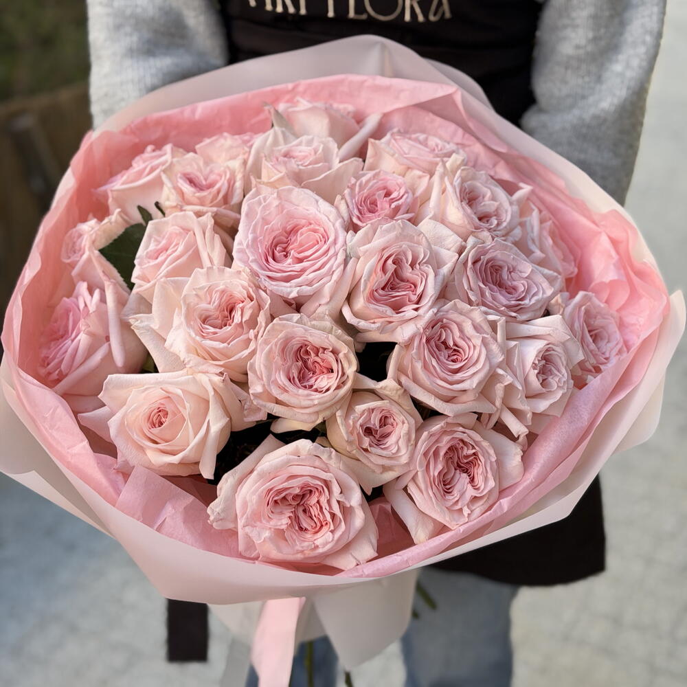 Ekskluzywny bukiet z 25 róż O’Hara w delikatnym, pudrowym odcieniu różu. Róże O’Hara wyróżniają się dużymi, piwoniowymi główkami i subtelnym, luksusowym wyglądem — to jedne z najbardziej efektownych róż dostępnych na rynku. Bukiet wygląda niezwykle elegancko i romantycznie, idealnie sprawdzi się na prezent, ważną okazję lub wtedy, gdy chce się zrobić prawdziwe wrażenie. To bukiet, który mówi więcej niż słowa.