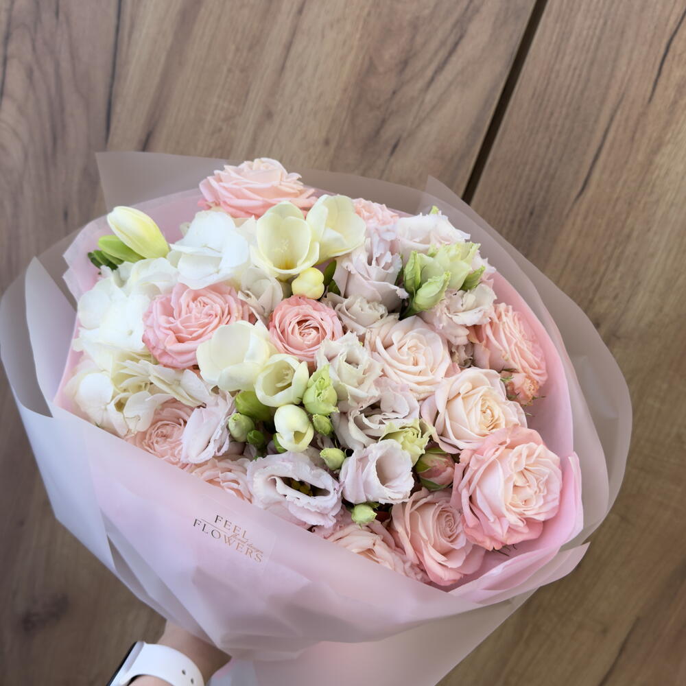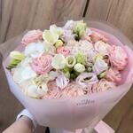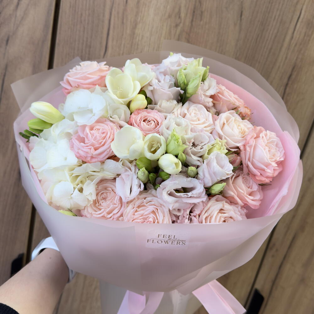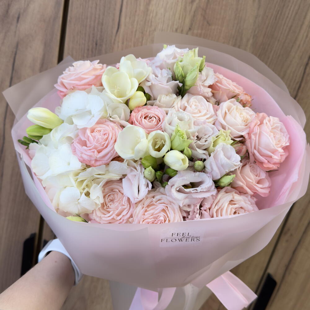 Eustoma - 2 szt. bombastyczny - 5 szt. hortensja - 1 szt. frezja - 3 szt.