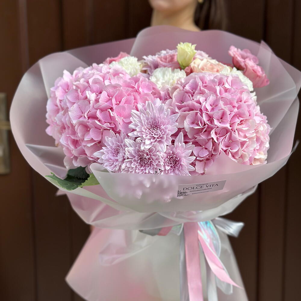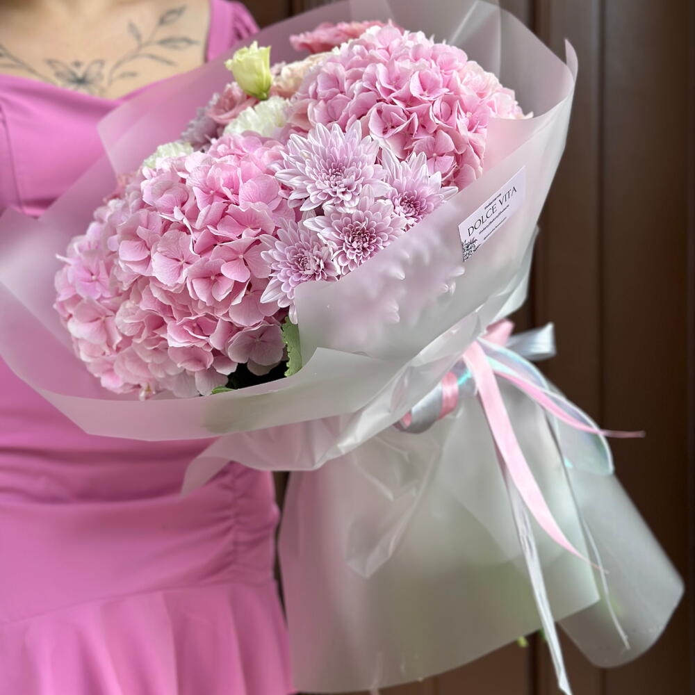 Eustoma - 3 szt. chryzantema - 3 szt. goźdiki - 4 szt. hortensiia - 3 szt.