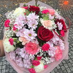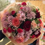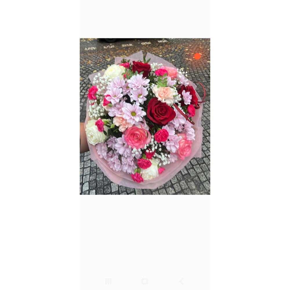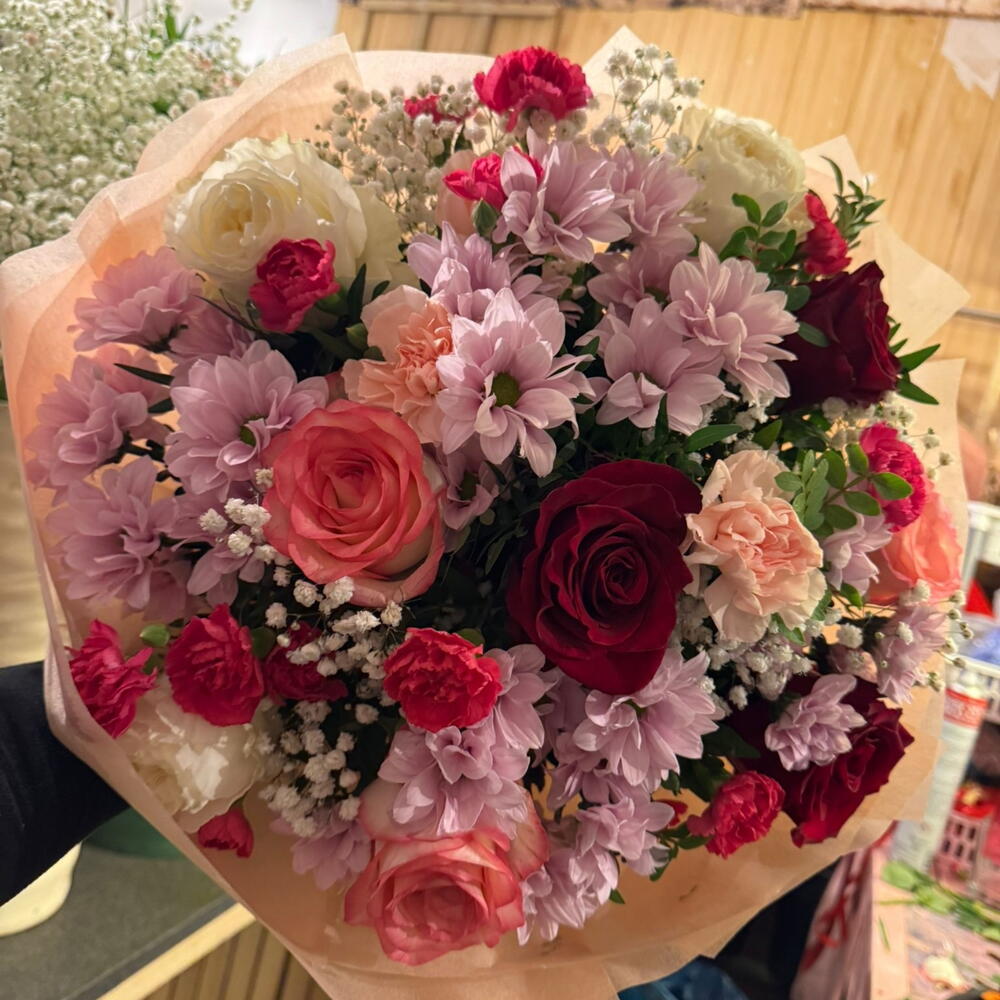 margaretka - 3 szt. gipsówka kolorowa - 1 szt. zieleń dekoracijna - 1 szt. papier dekoracyjny - 1 szt. gozdziki - 9 szt. róże kolorowe - 9 szt.