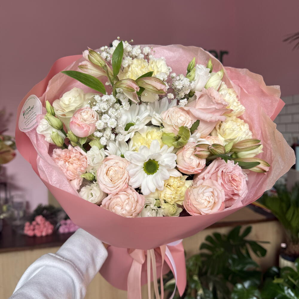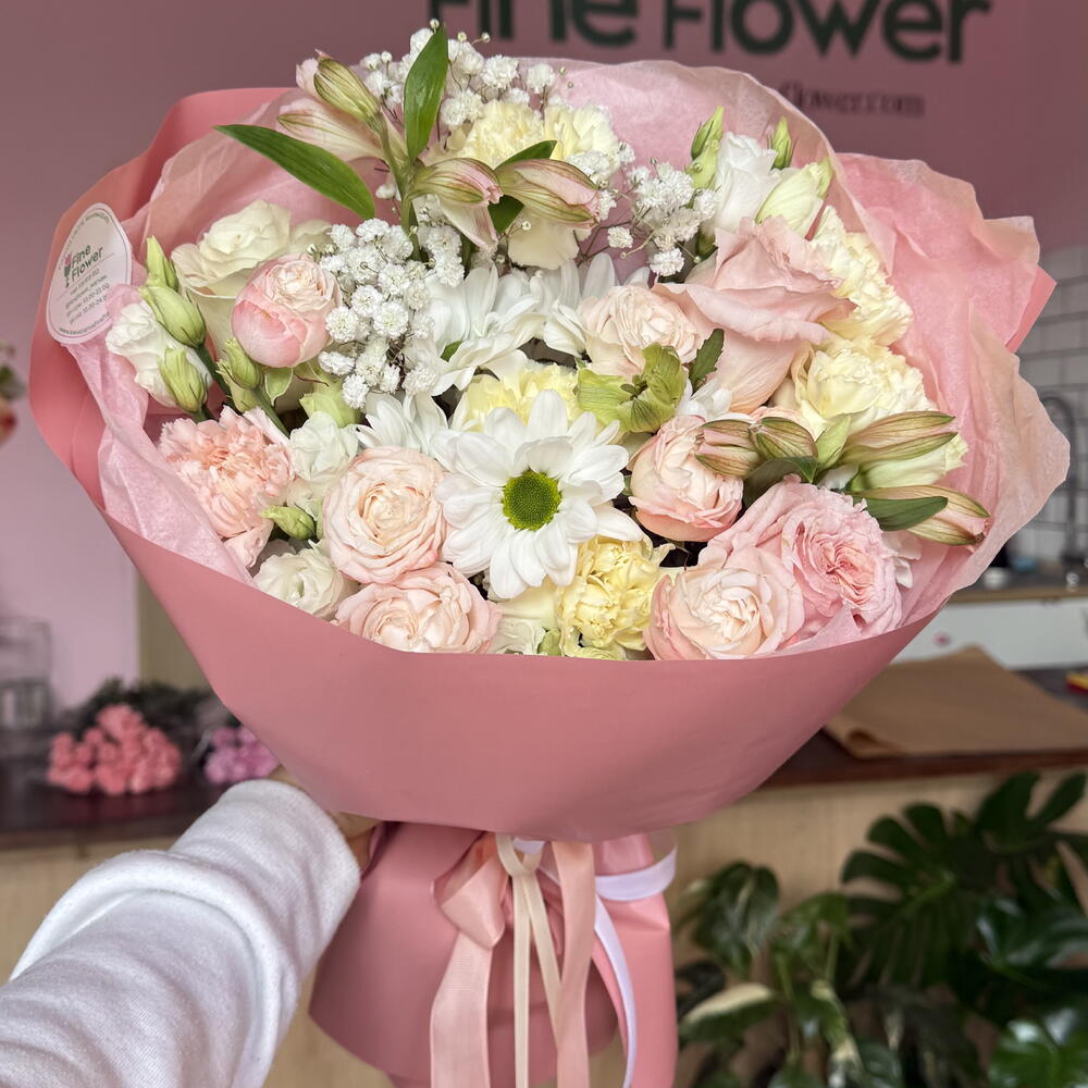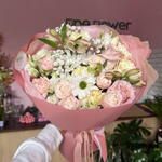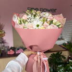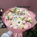 Eustoma - 1 szt. dianthus - 6 szt. róża - 3 szt. astromeria - 2 szt. róża gałązkowa - 1 szt. chryzantema - 1 szt. gipsówka - 1 szt.