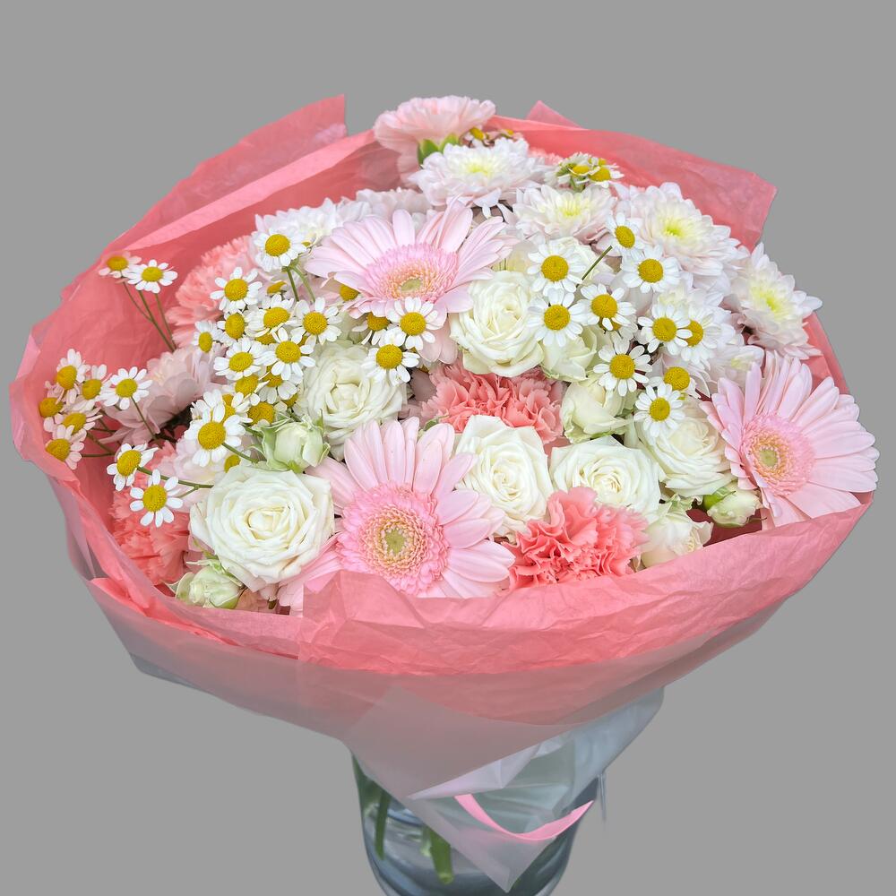 róża gałązkowa - 2 szt. goździk - 7 szt. gerbery - 3 szt. margaretka - 3 szt. papier ozdobny - 1 szt. rune - 2 szt.