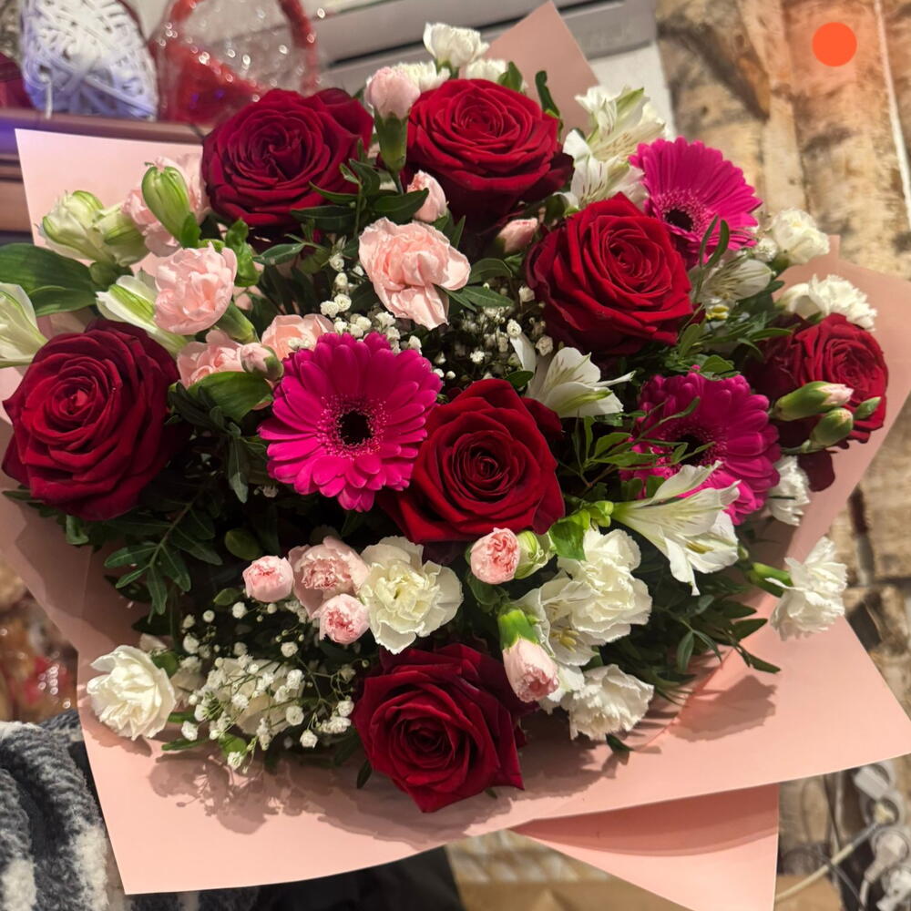 Zachwycający bukiet pełen uczuć! Połączenie klasycznych czerwonych róż, delikatnych goździków i energetycznych gerber tworzy kompozycję idealną na każdą okazję .