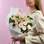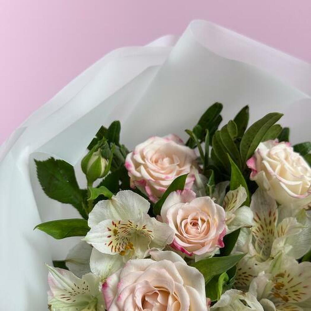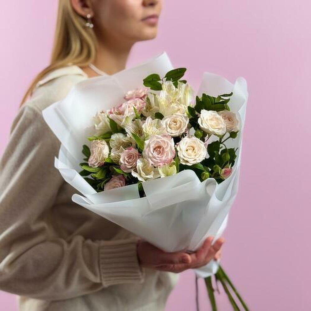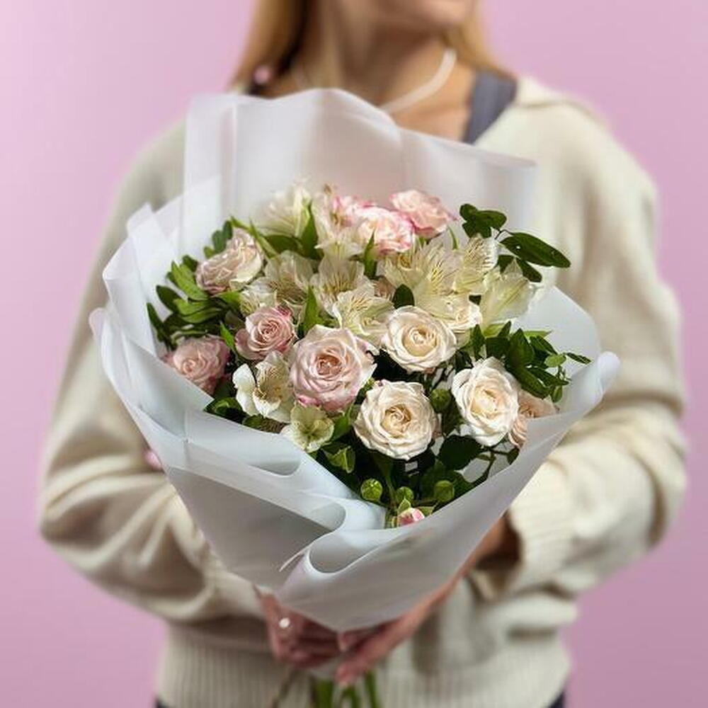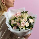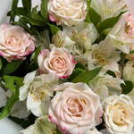 Delikatny i romantyczny bukiet skomponowany z uroczych róż gałązkowych w subtelnych pastelowych odcieniach, białych alstremerii oraz świeżej zieleni, które nadają kompozycji naturalnej elegancji. Ten projekt, zapakowany w półprzezroczysty biały papier, doskonale wyraża czułość, miłość i wdzięczność — idealny na rocznice, urodziny lub po prostu, by sprawić radość komuś wyjątkowemu.