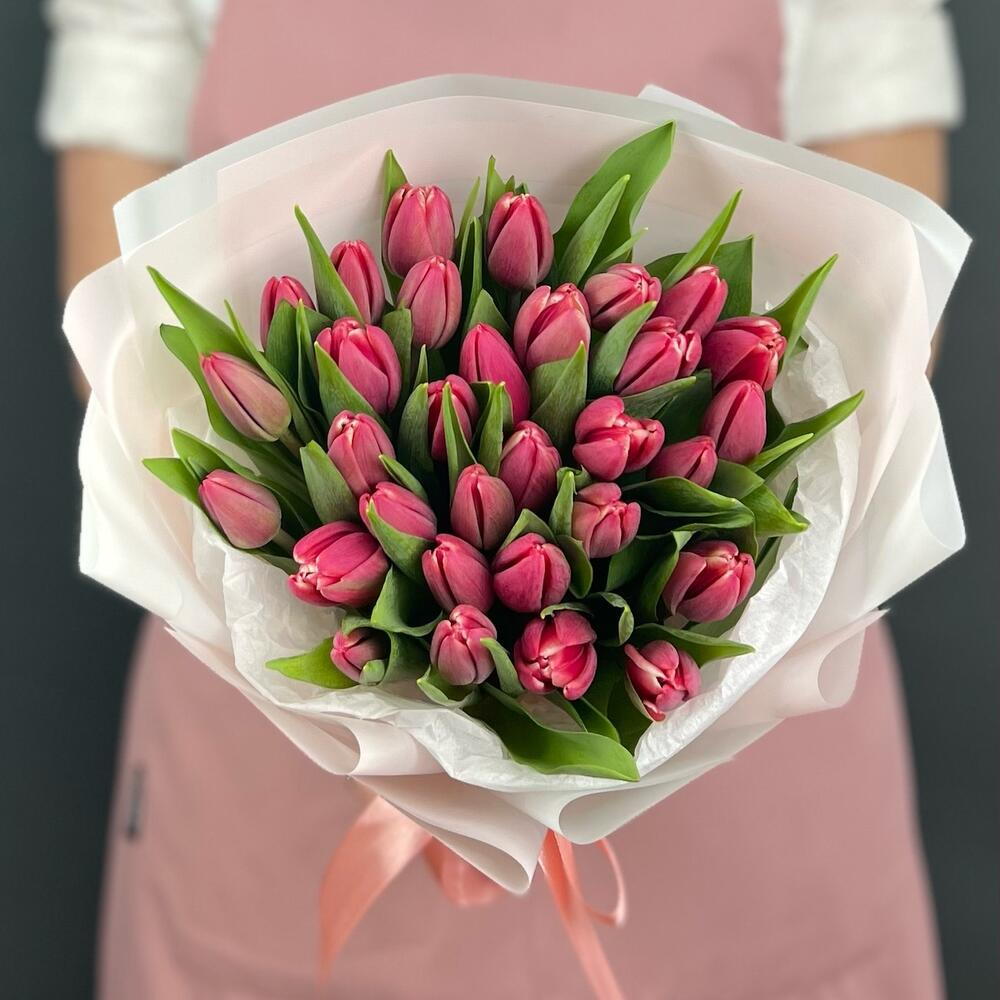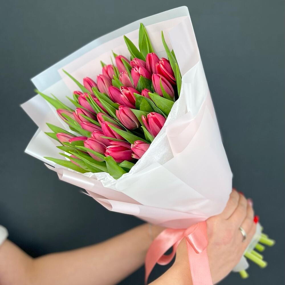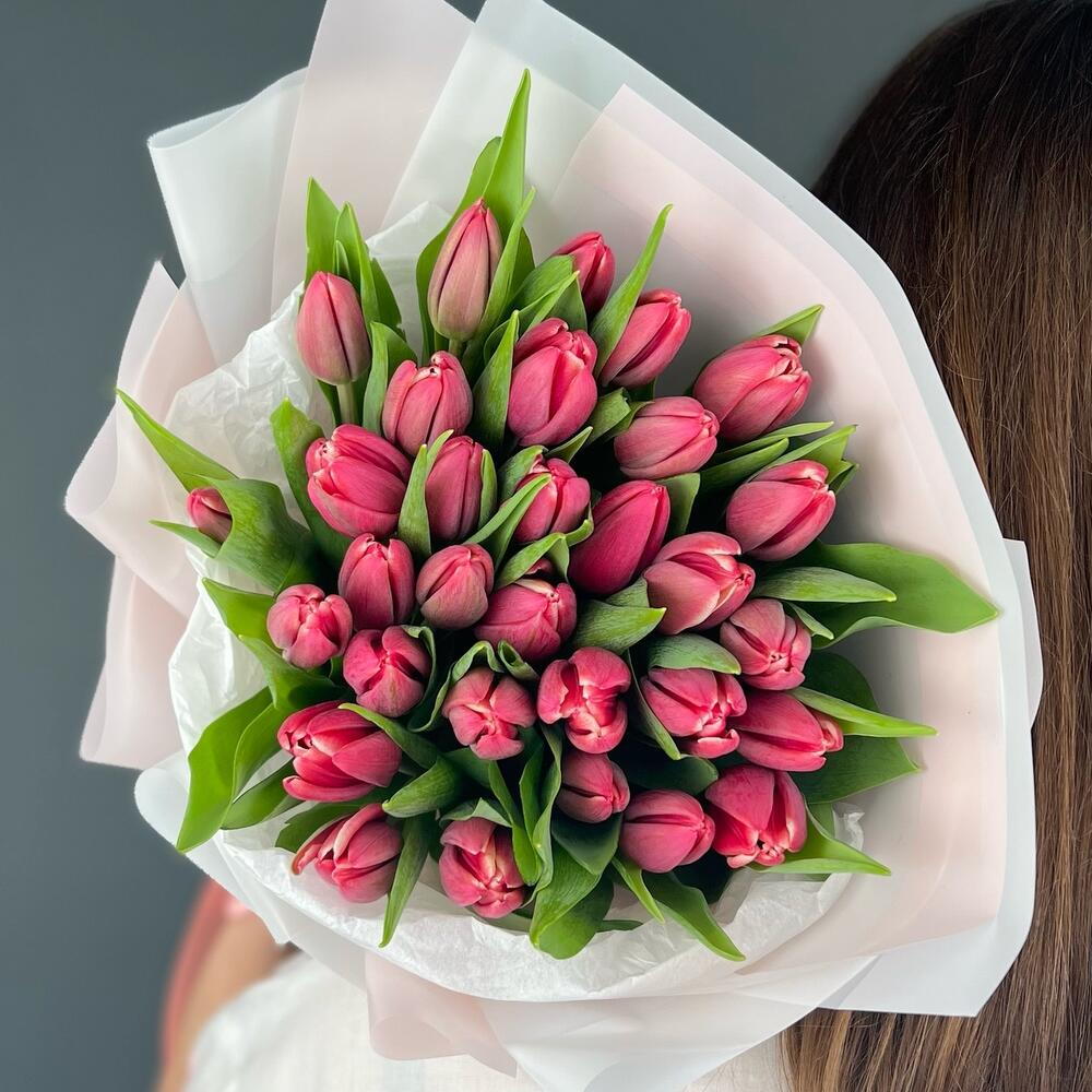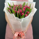 Zachwycający bukiet 31 intensywnie różowych tulipanów, który symbolizuje piękno, ciepło i podziw. Obfite kwiaty tworzą bogatą i efektowną kompozycję, podkreśloną świeżą zielenią i eleganckim opakowaniem. Idealny na ważne uroczystości lub wtedy, gdy chcesz zrobić niezapomniane i pełne uczuć wrażenie.