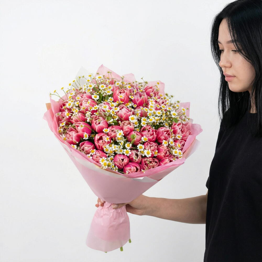 Skład bukietu: peoniowe tulipany, rumianek, papier dekoracyjny W zestawie: odżywka do kwiatów, bilecik z Twoimi życzeniami, bilecik jak dbać o kwiaty Na zdjęciu prezentowany jest bukiet z 35 tulipanów.
