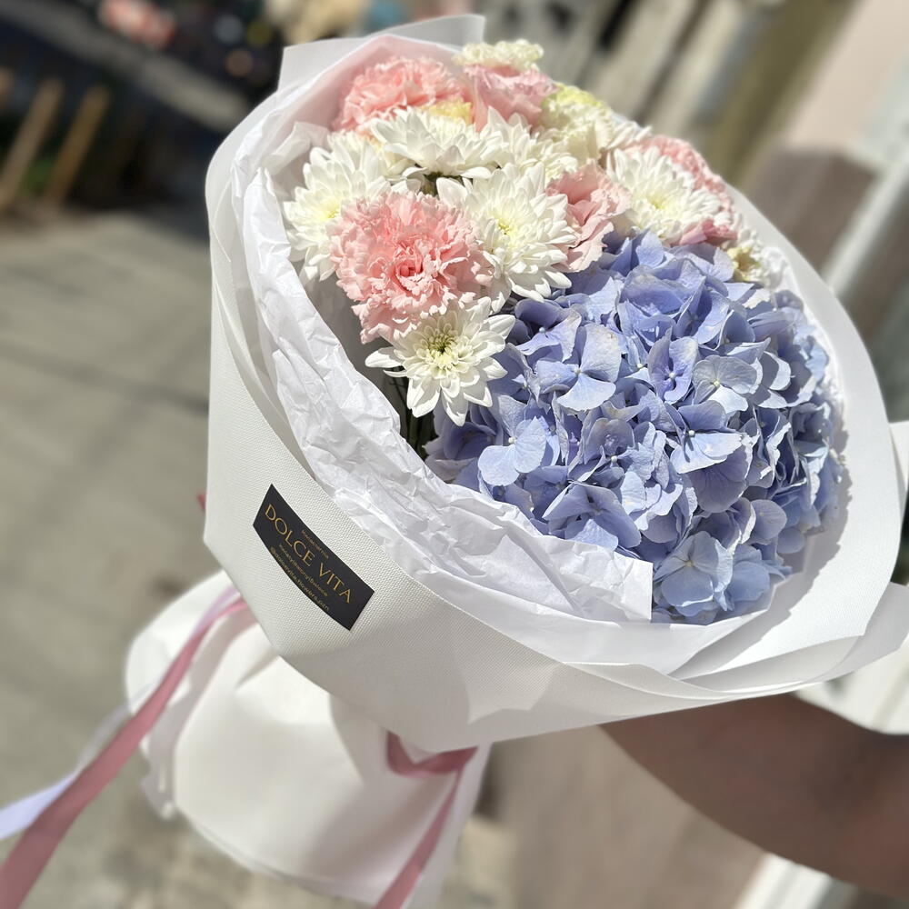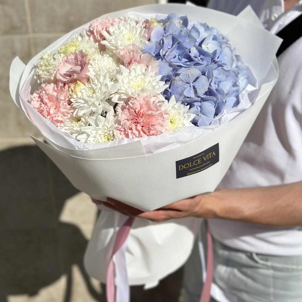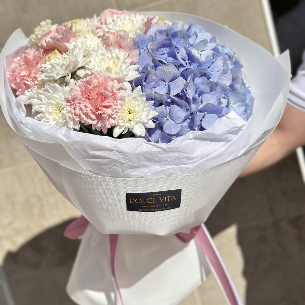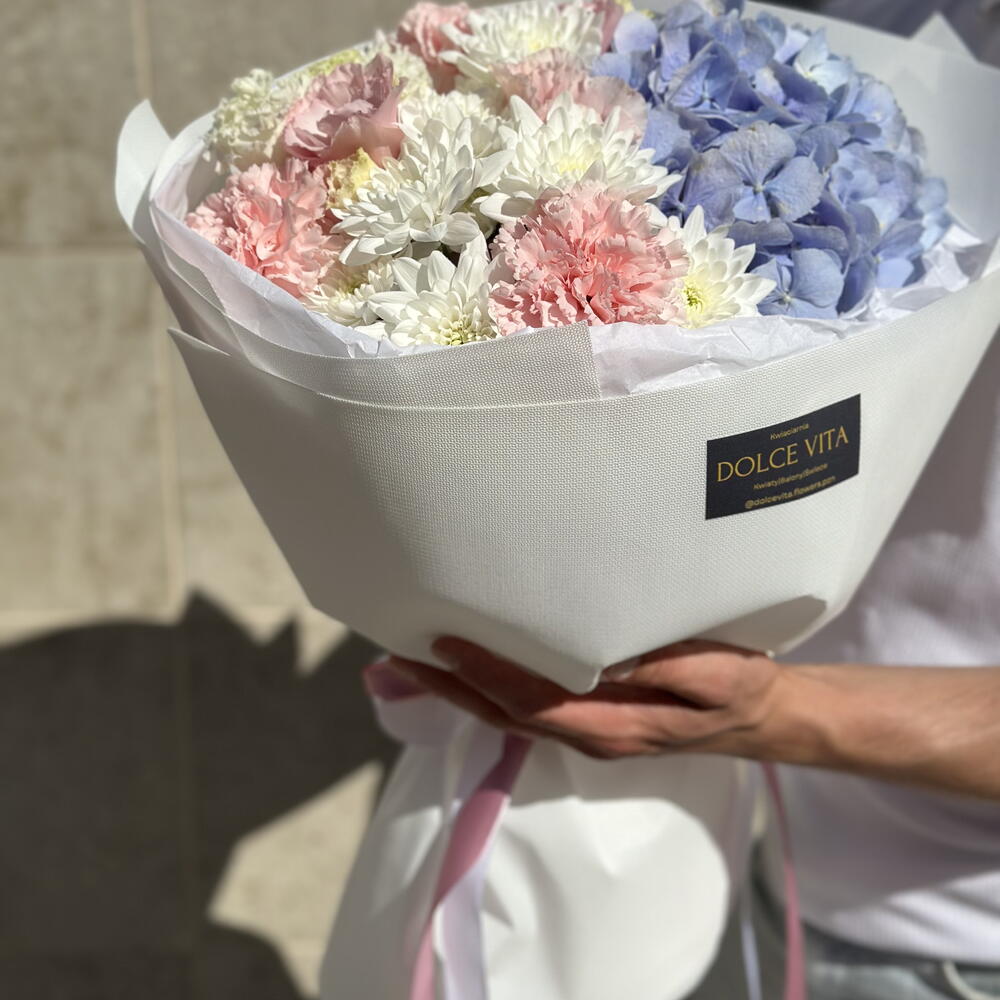 eustoma mix - 2 szt. chryzantema - 2 szt. goźdiki - 4 szt. hortensiia - 1 szt.