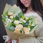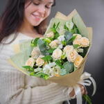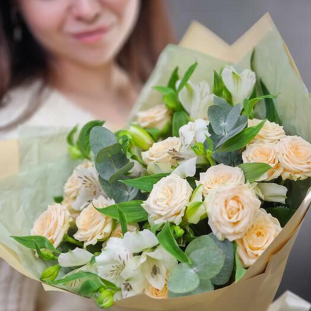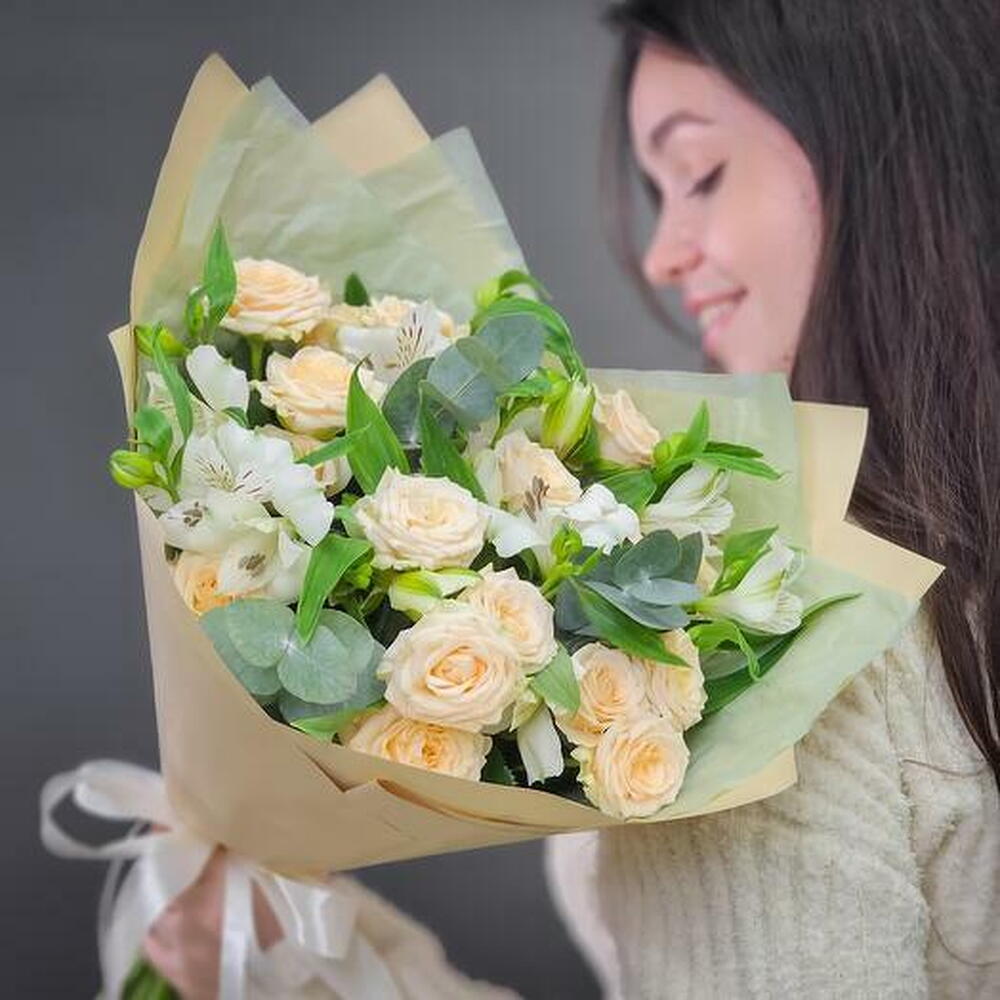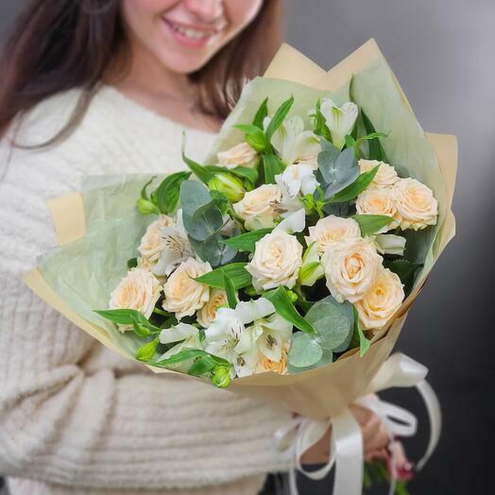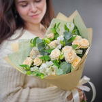 Elegancki i delikatny bukiet łączący urok kremowych róż z subtelnością białych alstremerii oraz świeżością liści eukaliptusa. Ta klasyczna i świetlista kompozycja emanuje spokojem i czułością, będąc idealnym wyborem na wyjątkowe okazje lub do wyrażenia uczuć w wyrafinowany sposób. Neutralne, naturalne odcienie bukietu podkreśla beżowe opakowanie, które dodaje mu ciepła i prostoty, eksponując piękno każdego kwiatu.