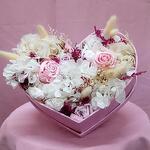 hortensia rehidratada - 5 szt. rosa rosa rehidratada - 2 szt. rosa lila rehidratada - 2 szt. rosa blanca rehidratada - 2 szt. colas de conejo - 6 szt. gipsofila rehidratada - 5 szt.