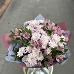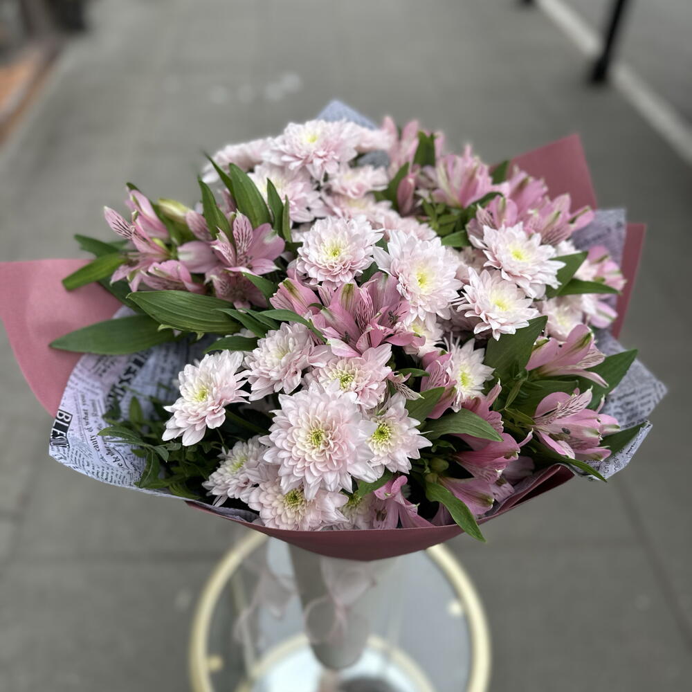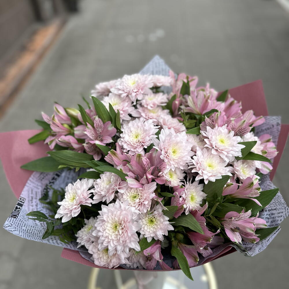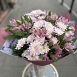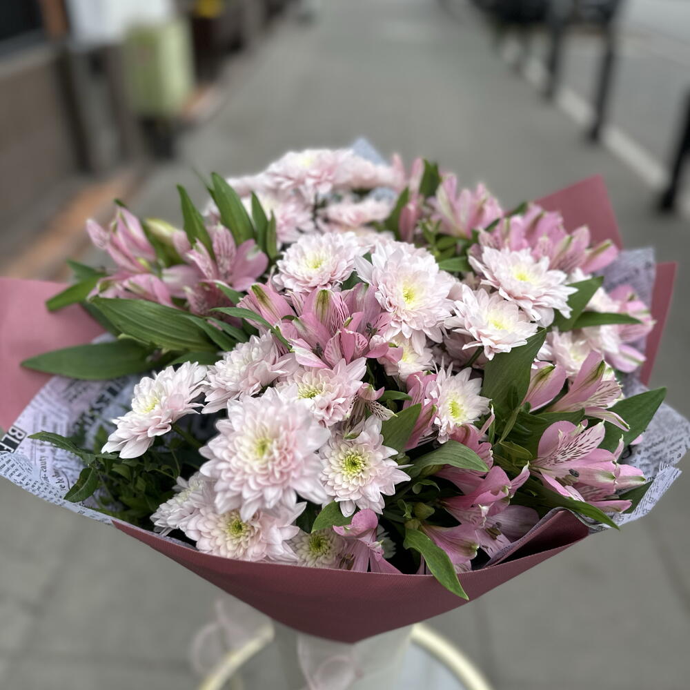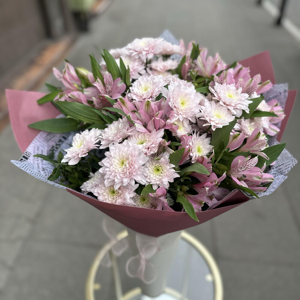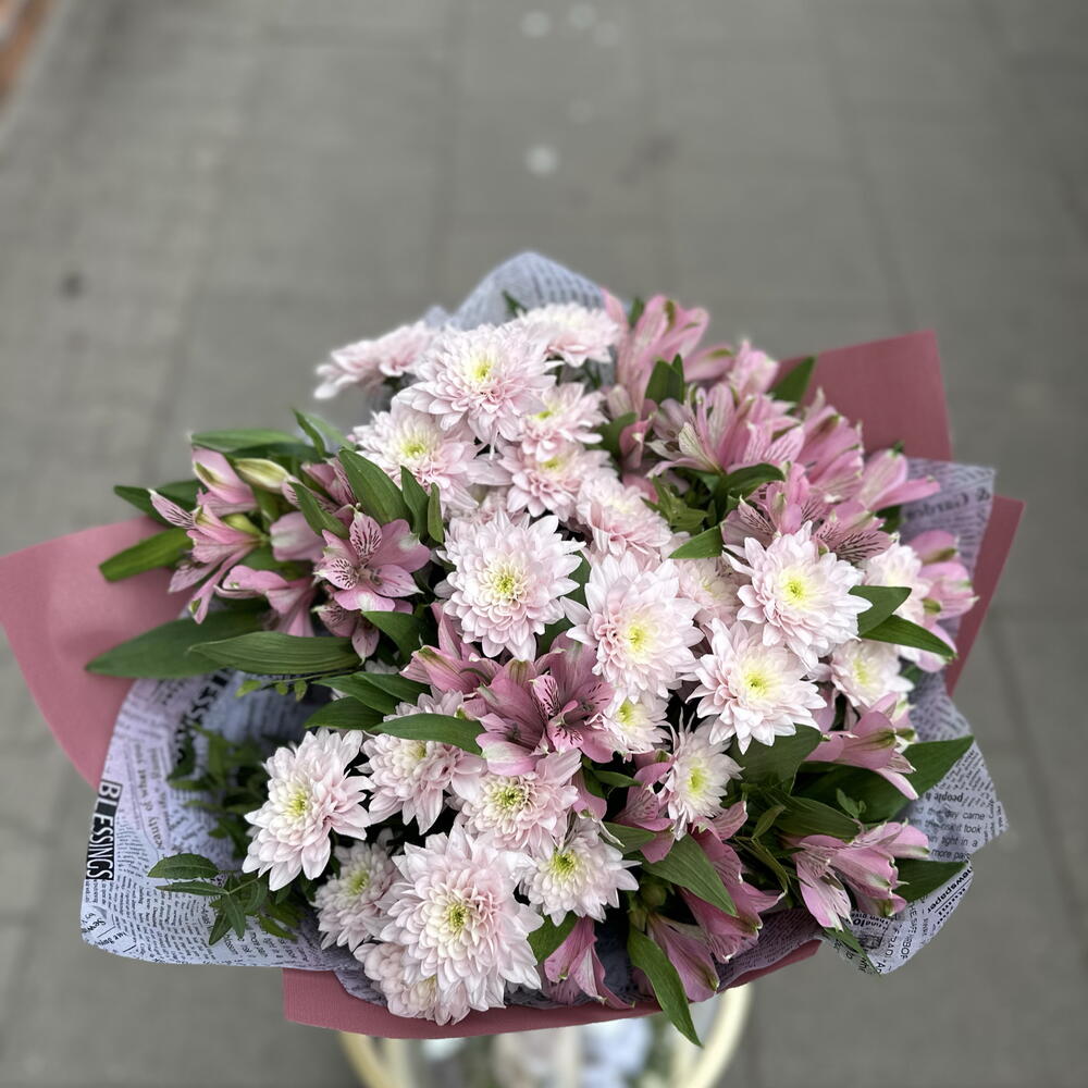 Krzew chryzantemy Baltica Pink - 11 szt. liście pistacjowe - 1 szt. mieszanka premium alstroemerii - 10 szt.