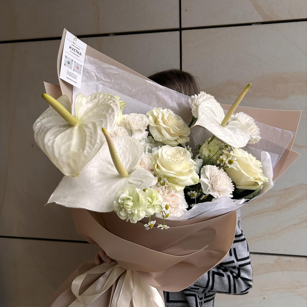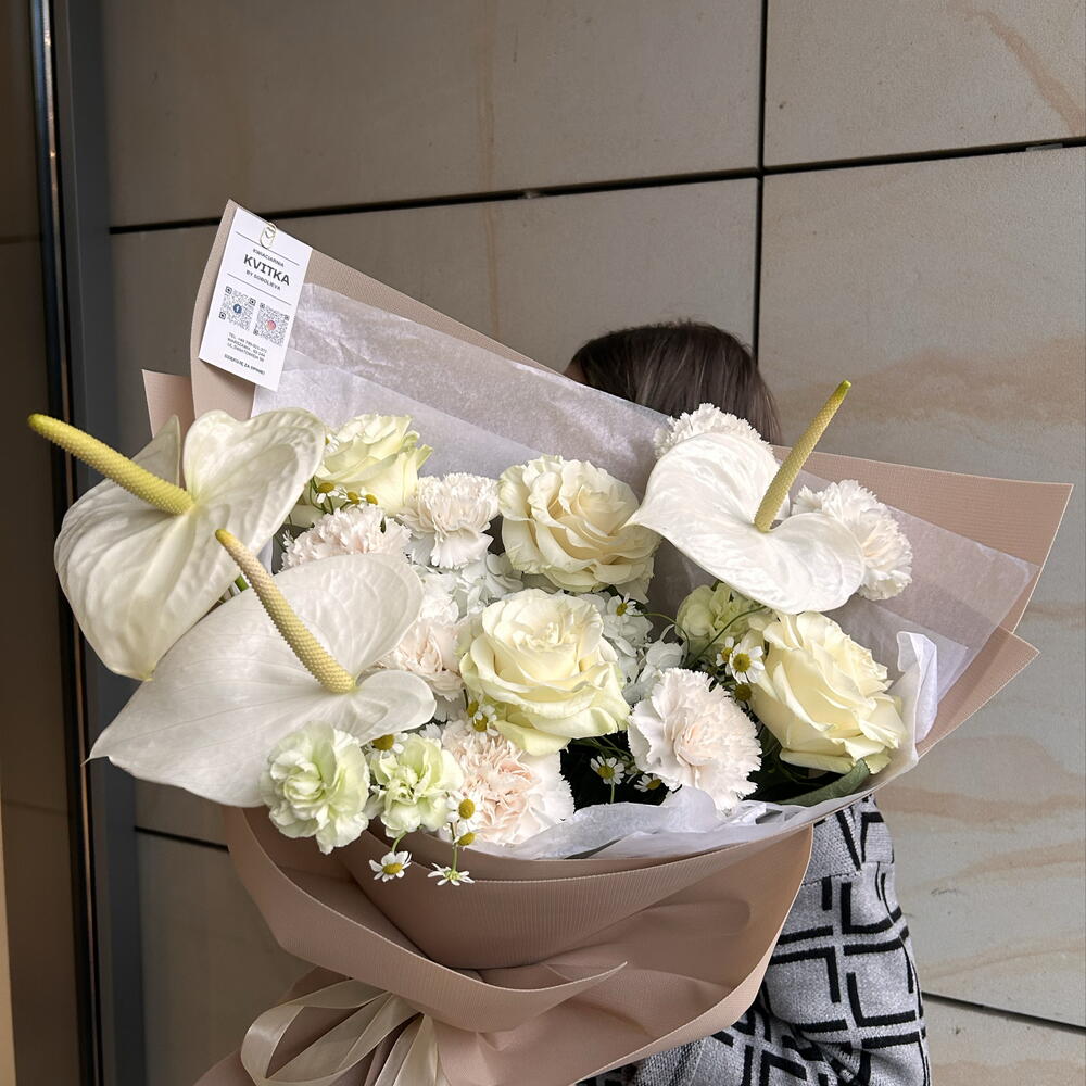 Anturium - 3 szt. hortensja - 1 szt. aquabox - 1 szt. goździki - 9 szt. papier dekoracyjny - 1 szt. róże białe - 4 szt.