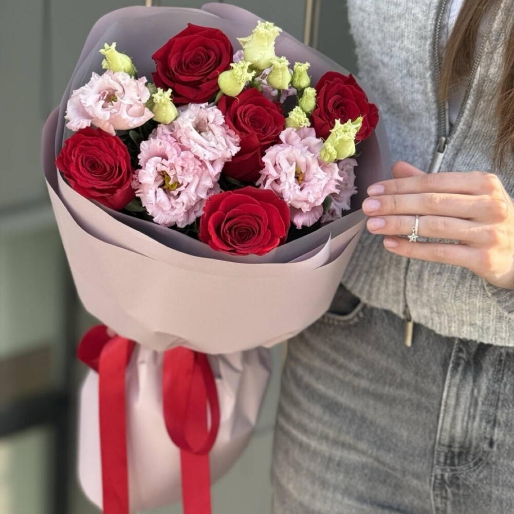 Mix czerwonych roż i eustom