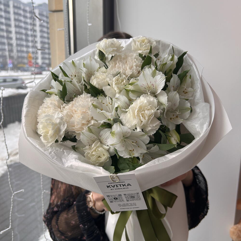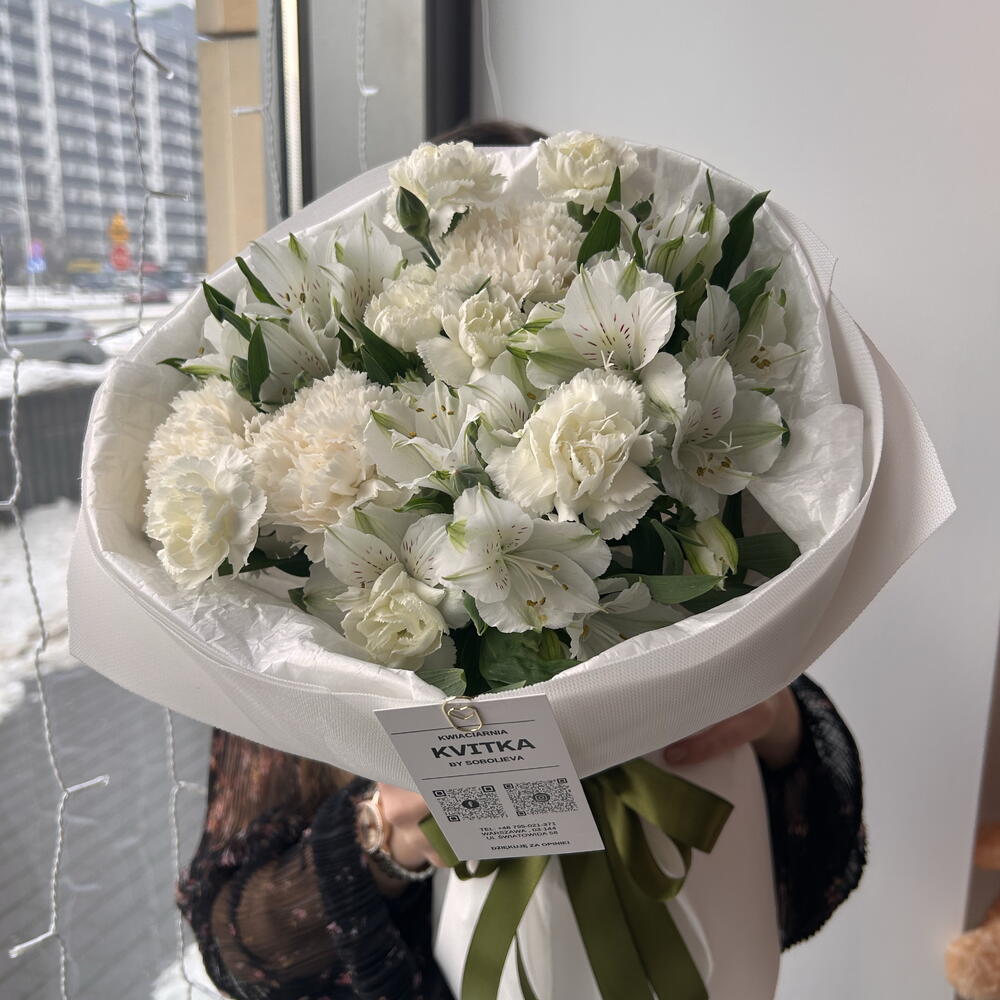 Alstroemeria - 3 szt. goździk - 8 szt. aquabox - 1 szt. papier dekoracyjny - 1 szt.