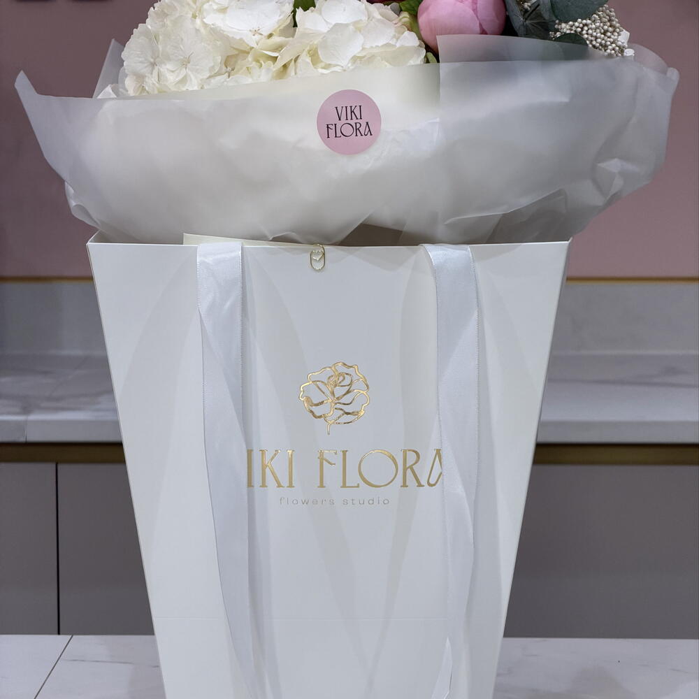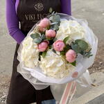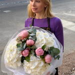 Subtelny, elegancki bukiet w jasnej, romantycznej kolorystyce, który zachwyca lekkością i naturalnym pięknem. Połączenie puszystych białych hortensji z pełnymi, różowymi piwoniami tworzy wyjątkową kompozycję, idealną na prezent dla bliskiej osoby, urodziny lub jako gest bez okazji. Bukiet wygląda luksusowo, a jednocześnie świeżo i nowocześnie — doskonale wpisuje się w aktualne trendy florystyczne.
