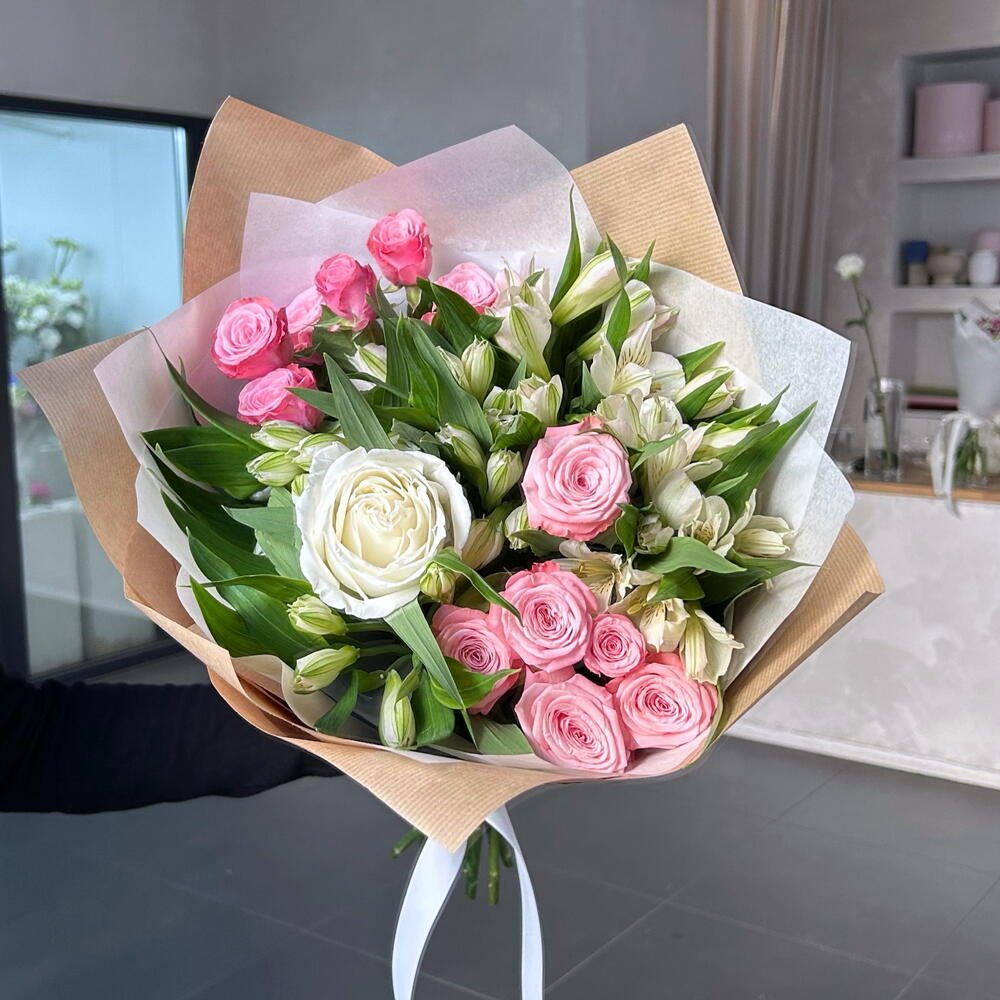 Subtelna kompozycja z pudrowo-różowych i kremowej róży, uzupełniona jasnymi, delikatnymi kwiatami. Elegancko zapakowany w naturalny papier i przewiązany wstążką. Idealny na romantyczny gest, podziękowanie lub wyjątkową okazję 💕