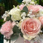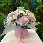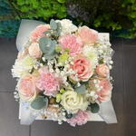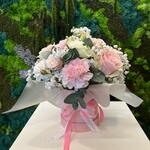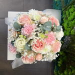 Gipsówka - 2 szt. Eustoma - 2 szt. Eukaliptus - 4 szt. Chryzantema - 1 szt. goździk - 5 szt. flowerbox - 1 szt. papier dekoracyjny - 1 szt. wstążka - 2 szt. róża bombastic - 2 szt. gąbka florystyczna - 1 szt. róża frutteto - 5 szt.