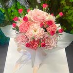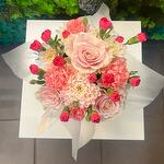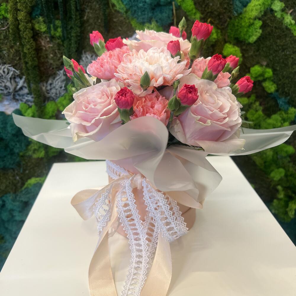 Chryzantema - 1 szt. pudełko z kwiatami - 1 szt. goździk - 5 szt. róża różowa - 3 szt. papier dekoracyjny - 1 szt. gąbka florystyczna - 1 szt. gozdzik gólązkowy - 4 szt.