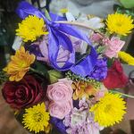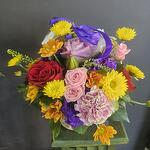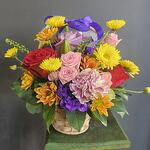 Small basket with mixed flowers. Type, variety and colours of flowers may vary depending on availability and season