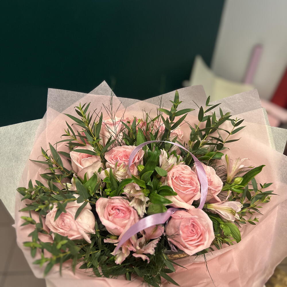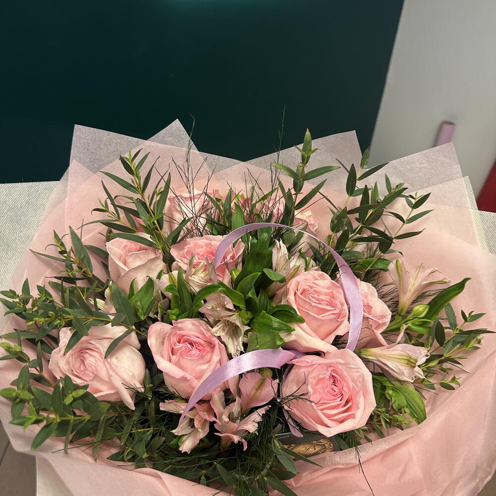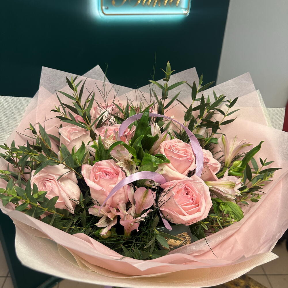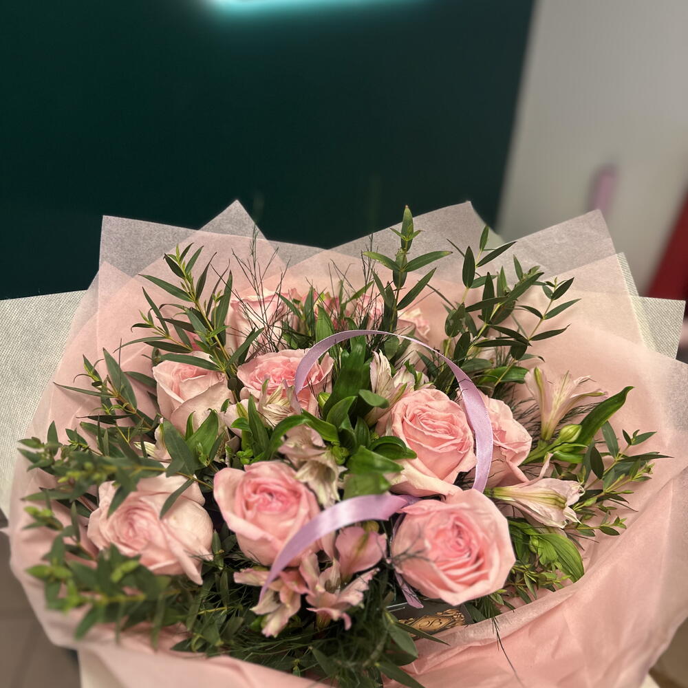 Ruscus - 5 szt. róża Pink O'Hara - 9 szt. dodatki kwiatowe - 5 szt. różowa astromelia - 5 szt.