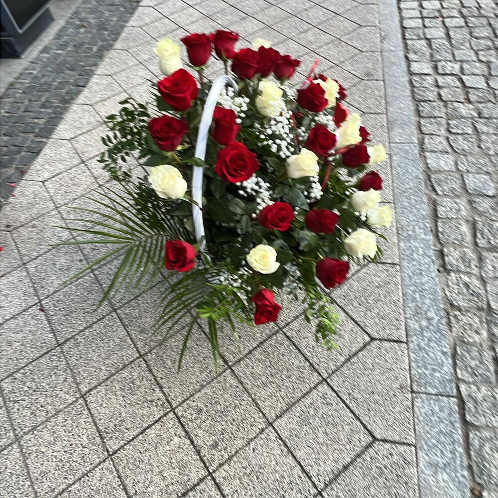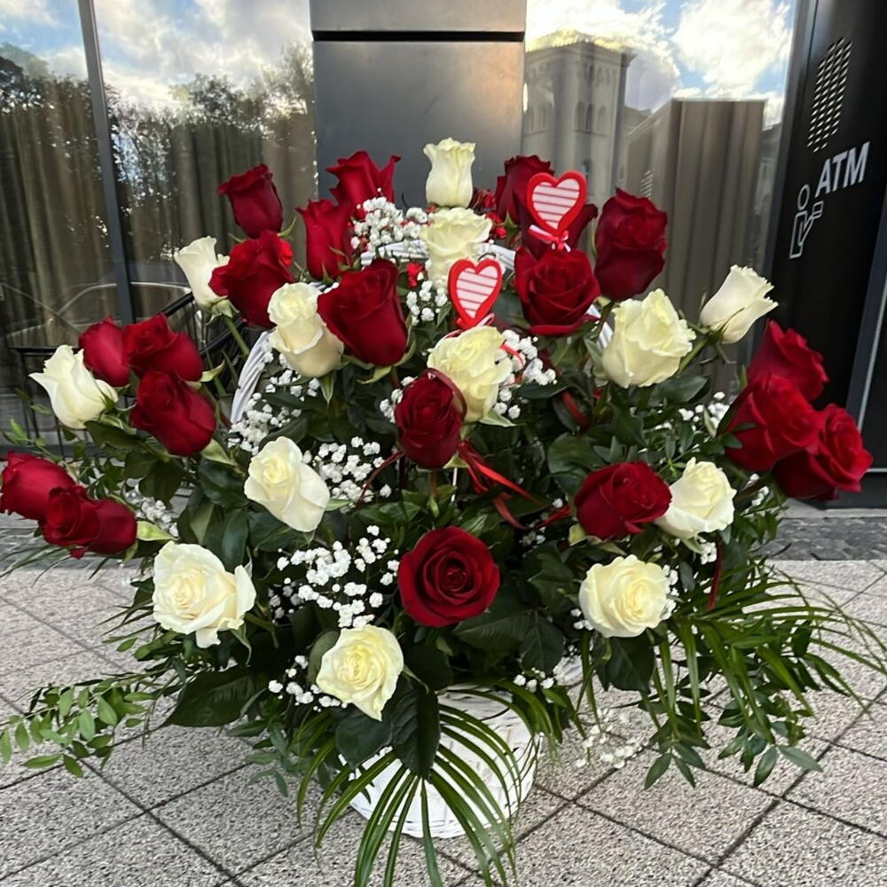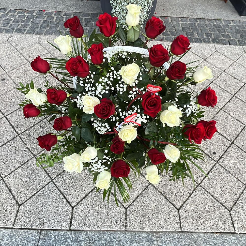 róże białe i czerwone - 25 szt. zieleń dekoracyjna - 7 szt. gipsówka biała - 1 szt. koszyk - 1 szt. serca - 2 szt.