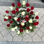 Elegancka kompozycja kwiatów w koszu — klasyczne połączenie czerwonych i kremowych róż, delikatnej gipsówki oraz zielonych dodatków. Ułożenie w białym koszu nadaje całości stylu i uroczystego charakteru. Idealna propozycja na rocznicę, gratulacje, jubileusz lub wyjątkowe podziękowanie. Wyraz szacunku, miłości i podziwu w efektownej formie.