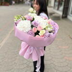 Wstążka satynowa - 1 szt. Eustoma - 3 szt. Hortensja - 3 szt. róża - 9 szt. organza ribbon - 1 szt. piwonia spray rose - 5 szt. decorative wrapping - 1 szt.
