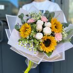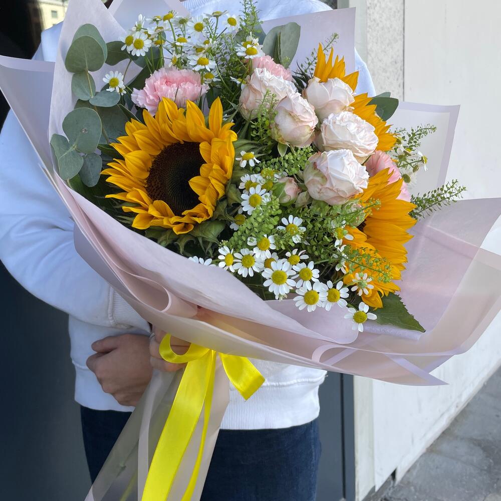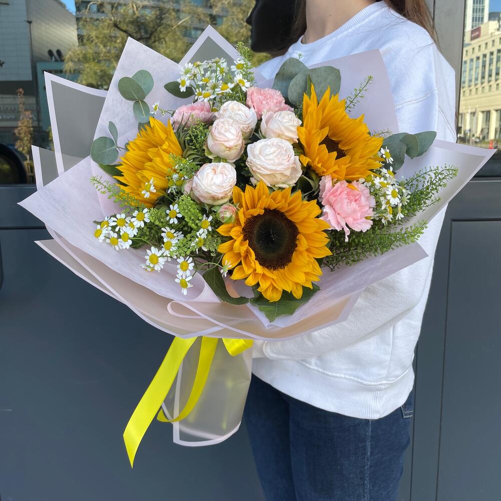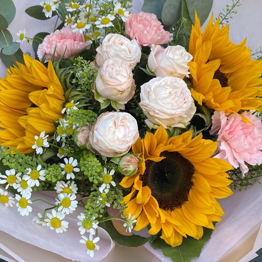 goździk - 3 szt. tanacetum - 4 szt. zielony - 4 szt. słonecznik - 3 szt. róże w sprayu - 2 szt. opakowania na kwiaty - 4 szt.