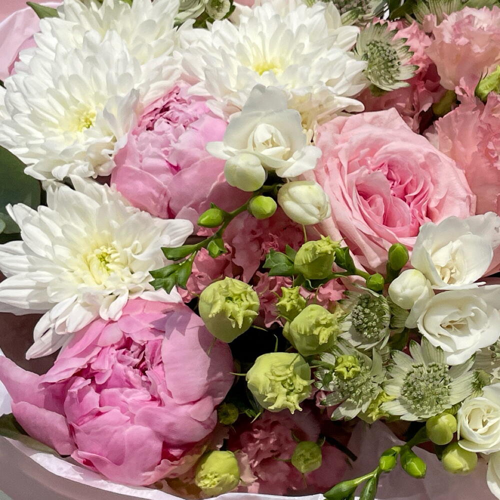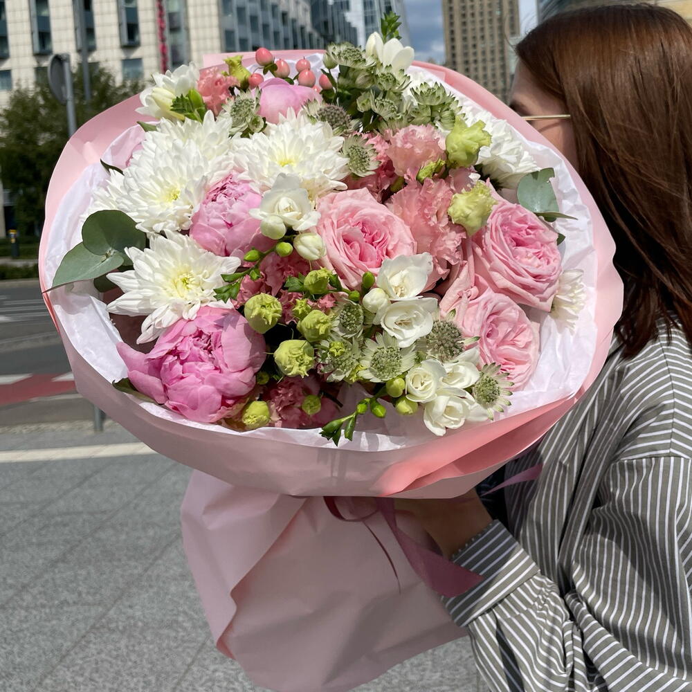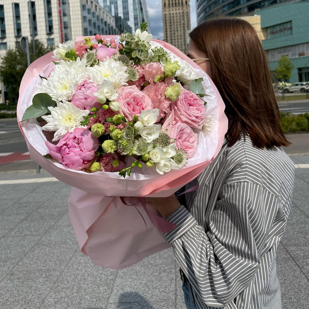 Freesia - 5 szt. piwonie - 5 szt. paking - 5 szt. chryzantema - 1 szt. róże - 5 szt. buplerium - 3 szt. eustoma - 3 szt. Dziurawiec zwyczajny - 3 szt. eukaliptus - 3 szt.