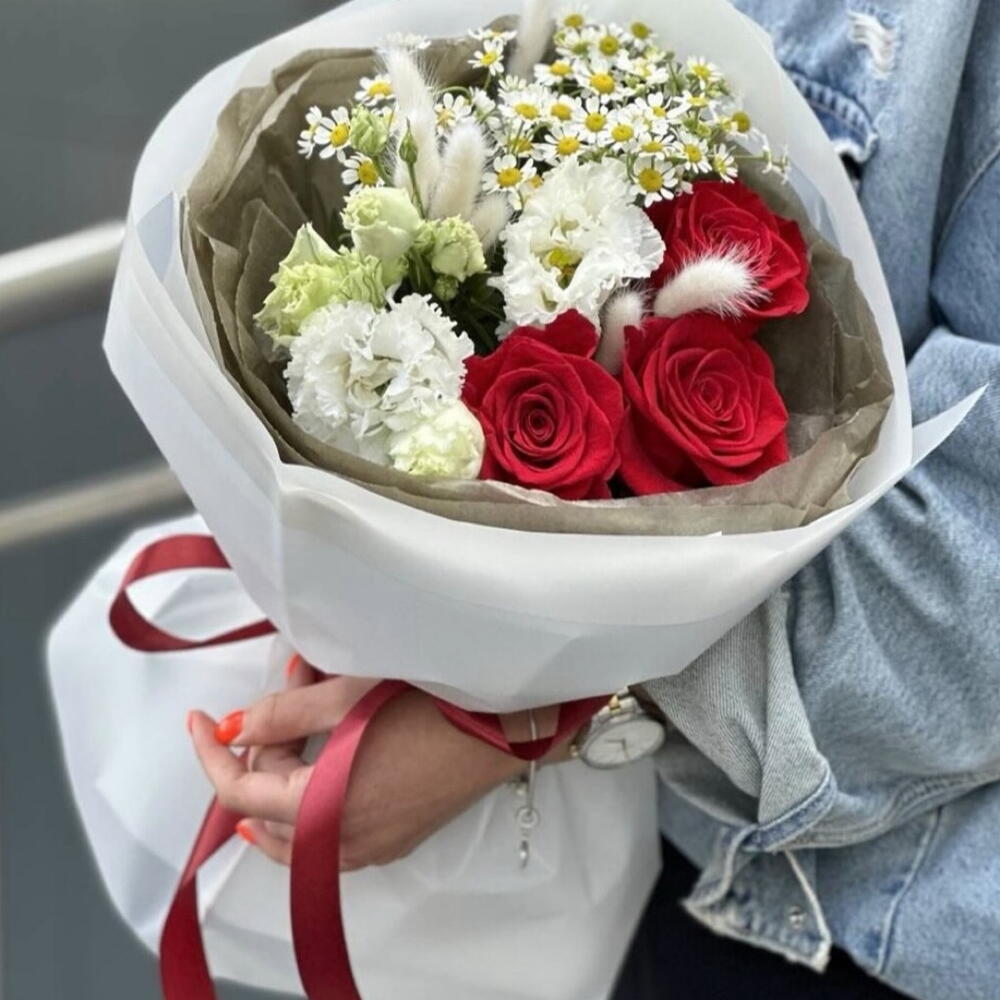Miła niespodzianka z czerwonymi rożami i eustoma
