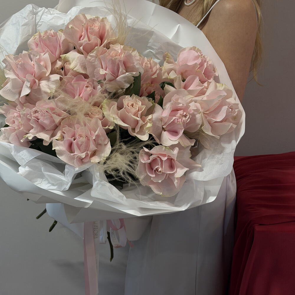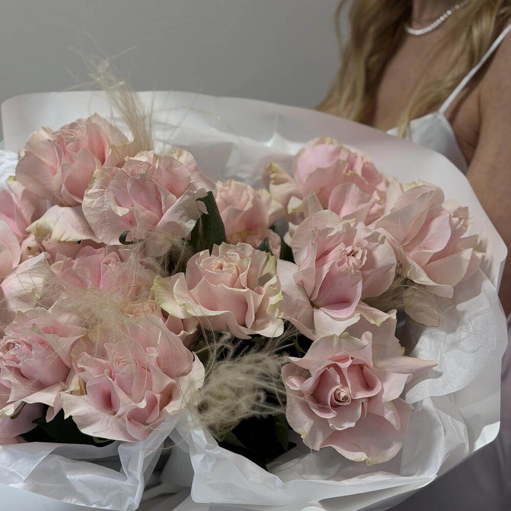 Elegancki monobukiet wykonany z francuskiej (wywiniętej). Róże pochodzą z Ekwadoru i wyróżniają się dużymi, pełnymi kwiatami oraz delikatnym, pudrowo-różowym odcieniem. Kompozycję uzupełnia stifa – naturalny suszony dodatek, który nadaje bukietowi lekkości, nowoczesnego charakteru i wyjątkowej struktury. Bukiet idealny na wyjątkowe okazje: urodziny, rocznicę, zaręczyny lub jako luksusowy prezent bez okazji. Całość starannie ułożona i zapakowana w estetyczną, minimalistyczną oprawę.