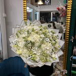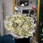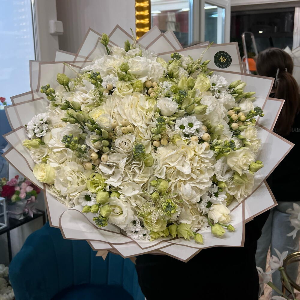Lisianthus - 9 szt. biała róża - 9 szt. hypericum - 7 szt. chryzantema - 7 szt. ortensie - 11 szt. carta - 9 szt.