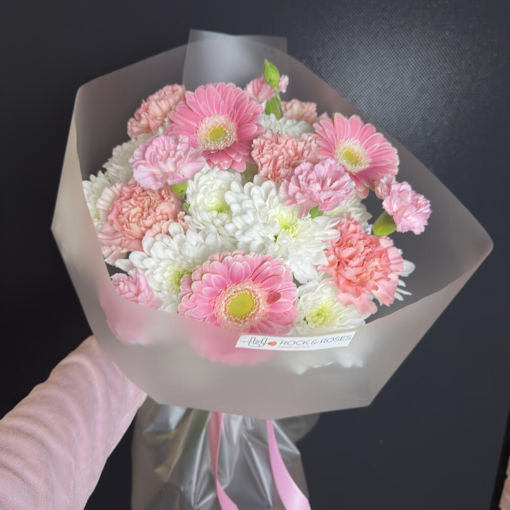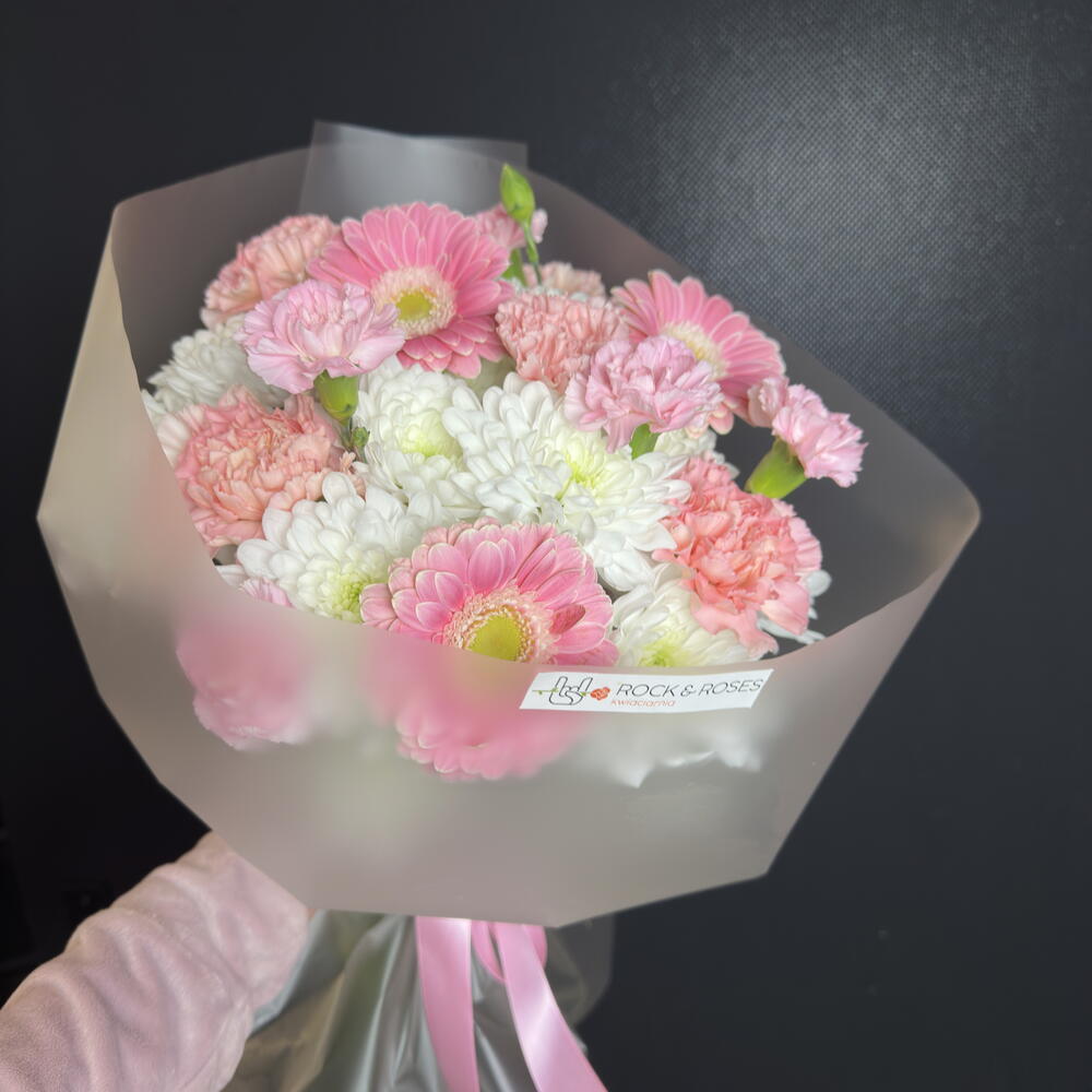 Prawdziwe ucieleśnienie delikatności i radości! Ten uroczy pastelowy bukiet składa się z radosnych, różowych gerber idealnie połączonych z eleganckimi, różowymi goździkami (dianthus) i puszystymi, białymi chryzantemami w gałązkach. Zapakowany w stylowy, matowy papier, to słodki i elegancki prezent, który natychmiast rozjaśni każdy dzień. Dlaczego warto wybrać ten bukiet: • 🌸 Wyjątkowa trwałość: Goździki i chryzantemy słyną z długiej żywotności w wazonie, co oznacza, że Twój prezent będzie cieszył Cię przez tygodnie. • 💖 Wszechstronny i słodki: Idealny wybór na urodziny, Dzień Matki lub po prostu jako gest „myślenia o Tobie”. • ✨ Piękna prezentacja: Delikatna, różowo-biała paleta barw to ponadczasowy klasyk, który kochają wszyscy. Składniki: • Różowe gerbery. • Różowe goździki (dianthus). • Białe chryzantemy w gałązkach. • Designerskie opakowanie z mrożonego szkła i różowa wstążka.