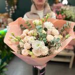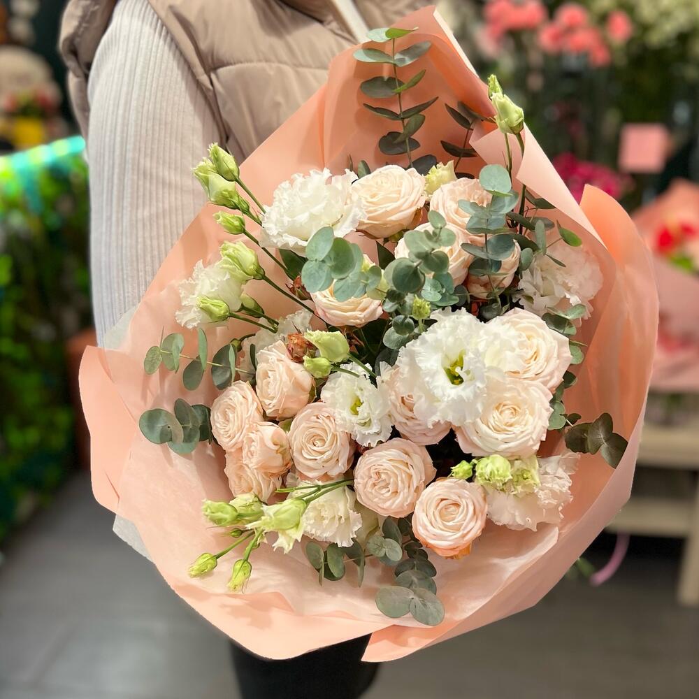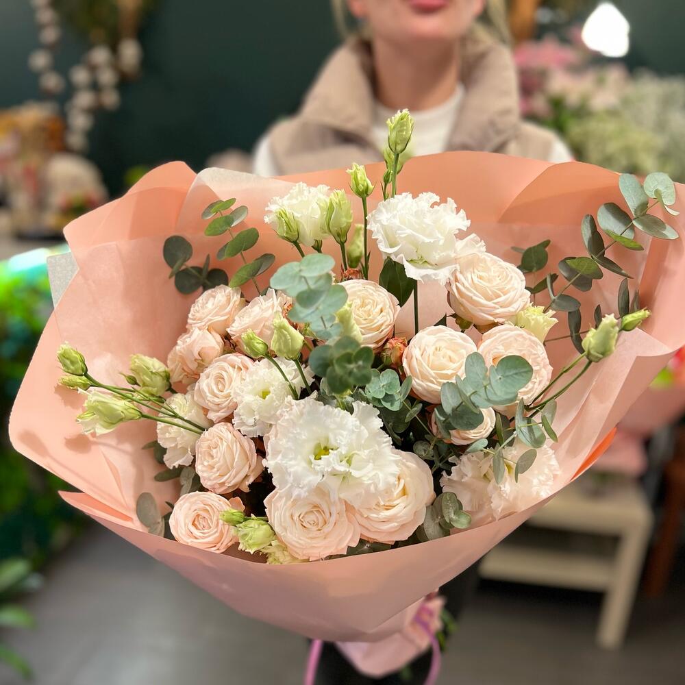 Eukaliptus - 3 szt. Eustoma biała - 2 szt. róża bombastic - 5 szt.