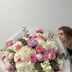 Hortensja - 9 szt. róża ogrodowa - 10 szt. pion - 15 szt. eukaliptus - 4 szt.
