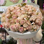 Delikatny, elegancki bukiet skomponowany z drobnych, pastelowych róż w odcieniach pudrowego różu i kremu. Gęsto ułożone pąki tworzą efekt miękkiej, romantycznej chmurki, która zachwyca subtelnością i klasą.