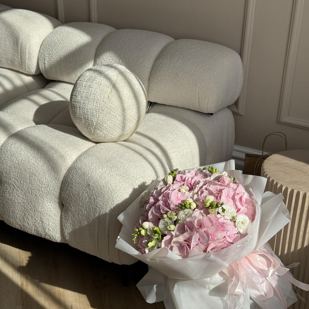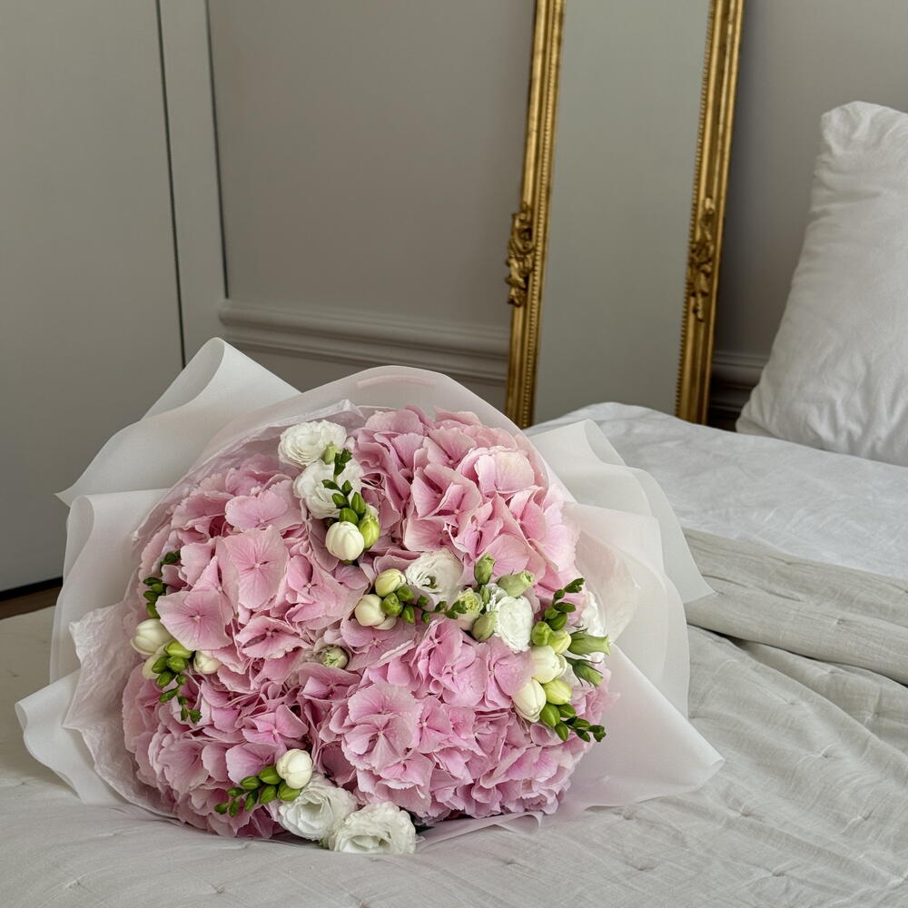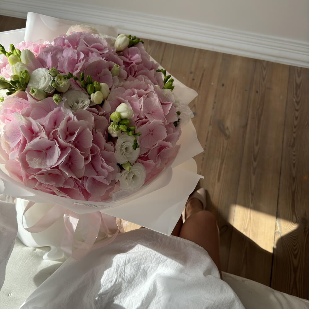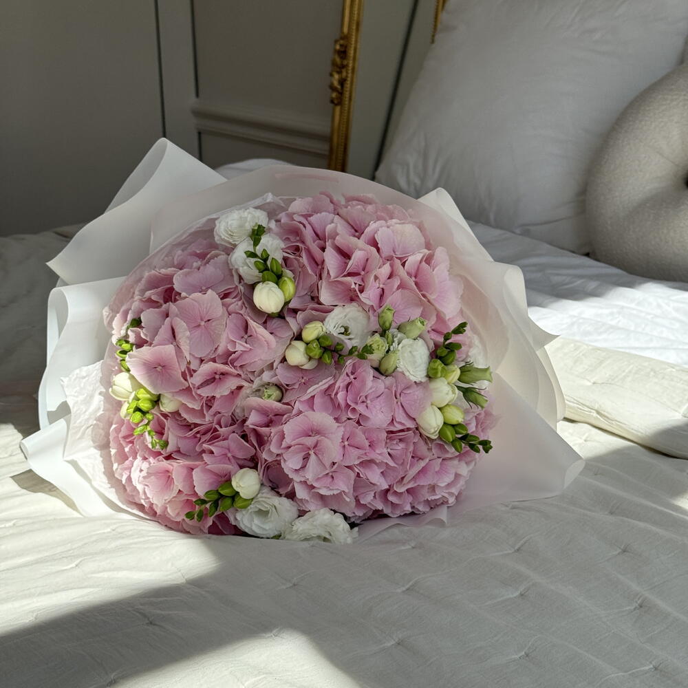 Zachwycający bukiet autorski, w którym z powodzeniem połączono 5 pięknych pędów eustomy, 5 okazałych hortensji i 9 pachnących frezji. Taki bukiet będzie idealną propozycją na prezent, który zapadnie w pamięć i wywoła niezapomniane emocje. Poczuj czarującą grę barw i rozkoszuj się niesamowitym aromatem świeżych kwiatów!