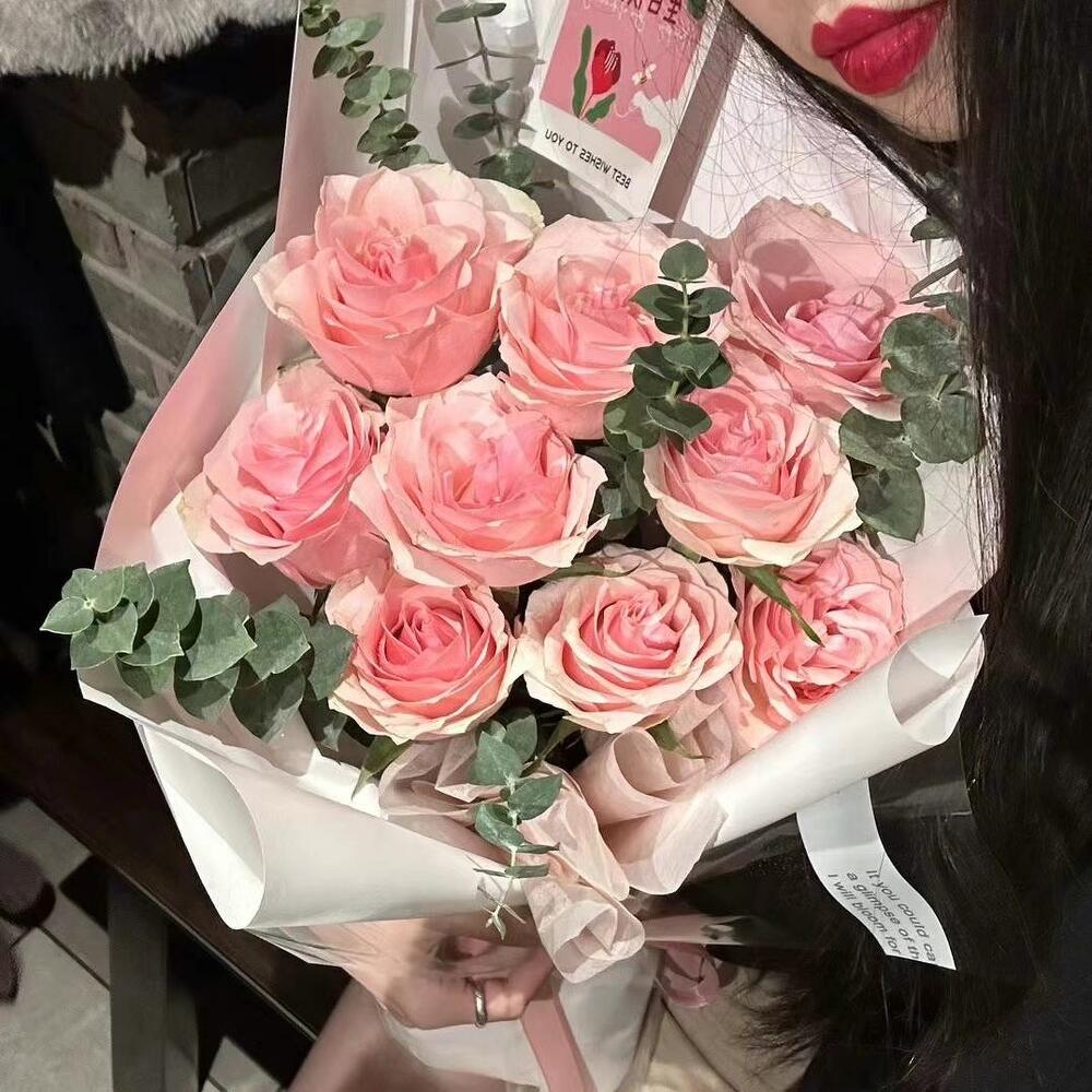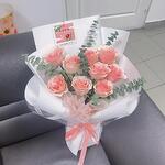A delicate arrangement of soft pink roses complemented by lush green foliage, wrapped in crisp white paper and finished with an elegant ribbon – a timeless gift for any occasion.