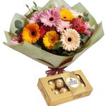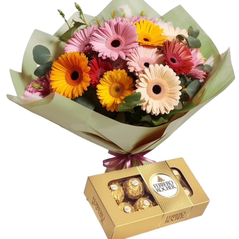 Gerbera - 12 szt. chocolates ferrero rocher - 8 szt. eukaliptus - 5 szt. ozdobna kokarda - 1 szt. papier koreański - 2 szt.