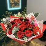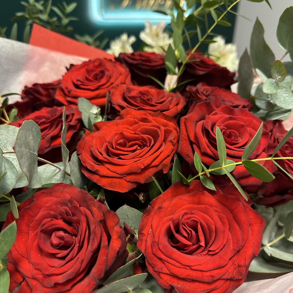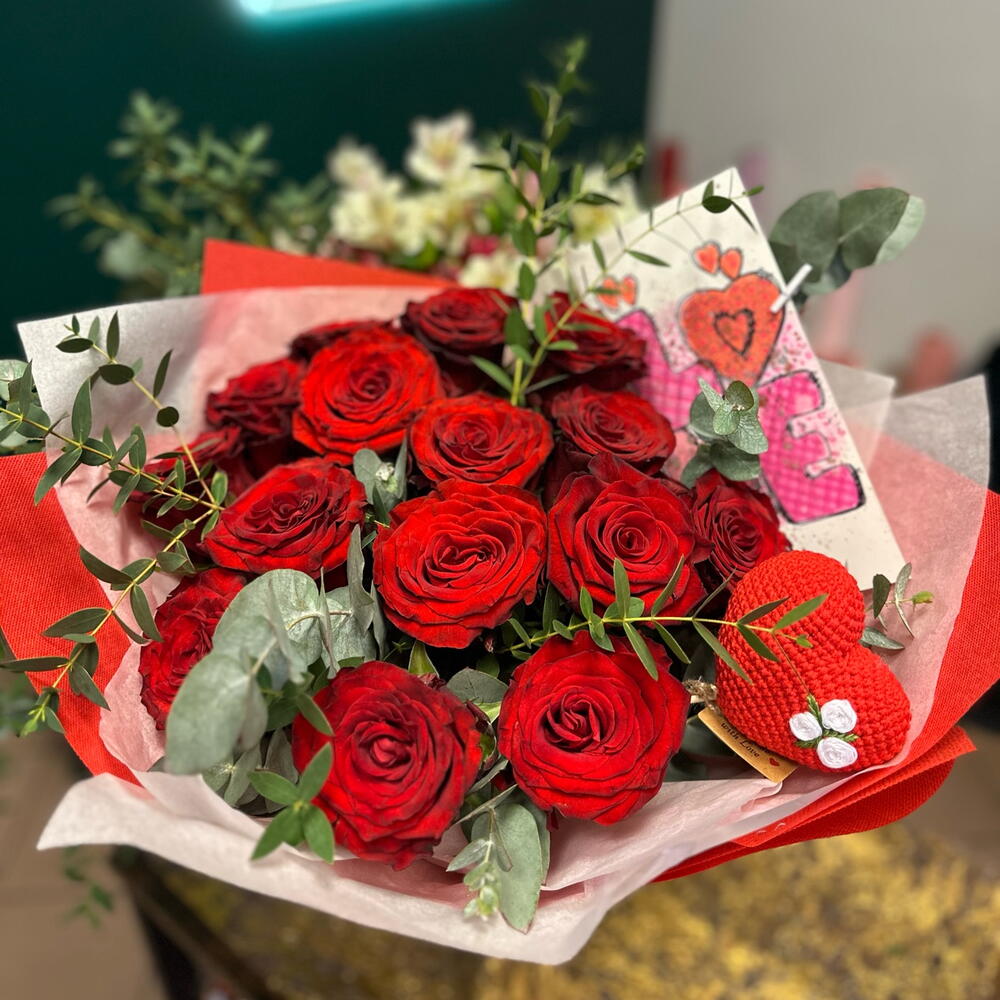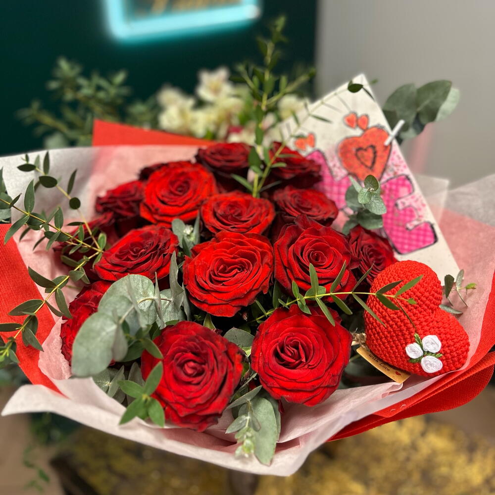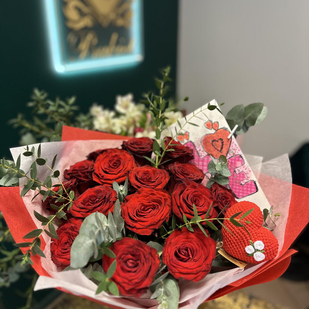 Eukaliptus - 5 szt. Ruscus - 3 szt. promienne czerwone róże - 15 szt. ręcznie wykonane serce - 1 szt. ręcznie robiona pocztówka - 1 szt.