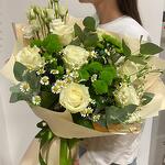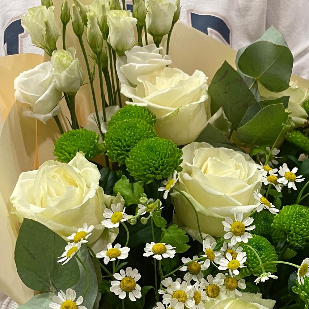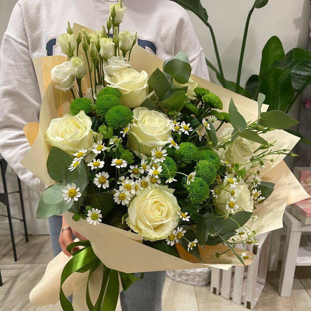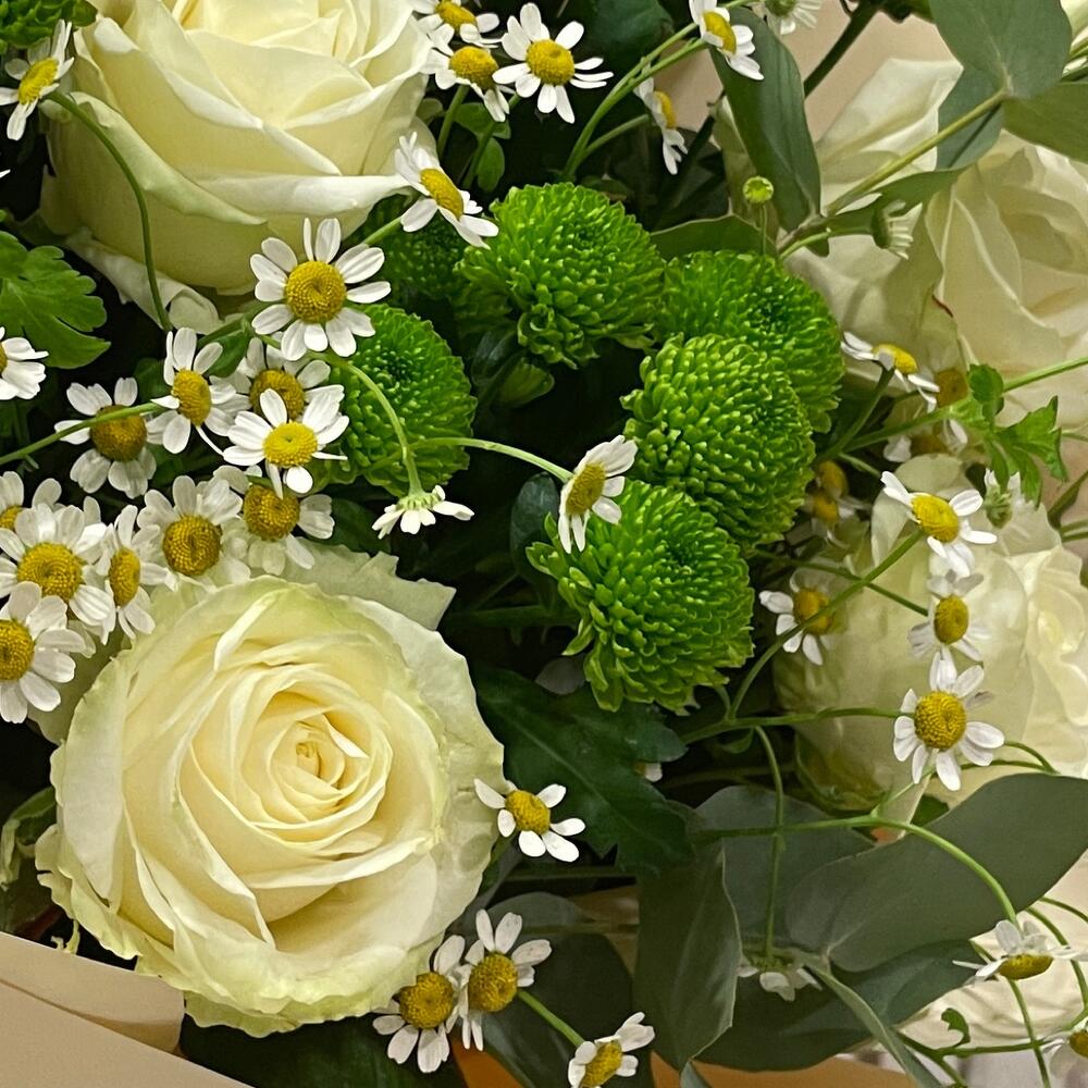 Eukaliptus - 4 szt. Chryzantema - 3 szt. Eustoma - 2 szt. biała róża - 7 szt. tanacetum - 3 szt. paking - 4 szt.