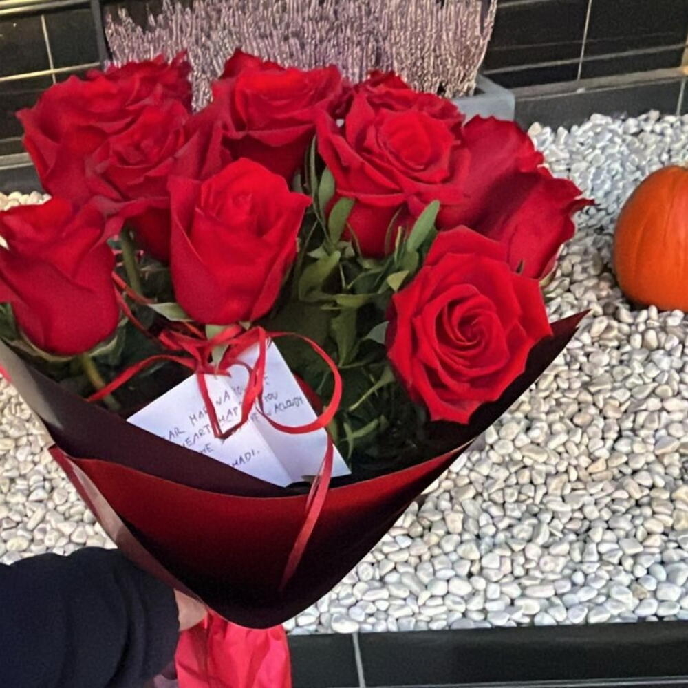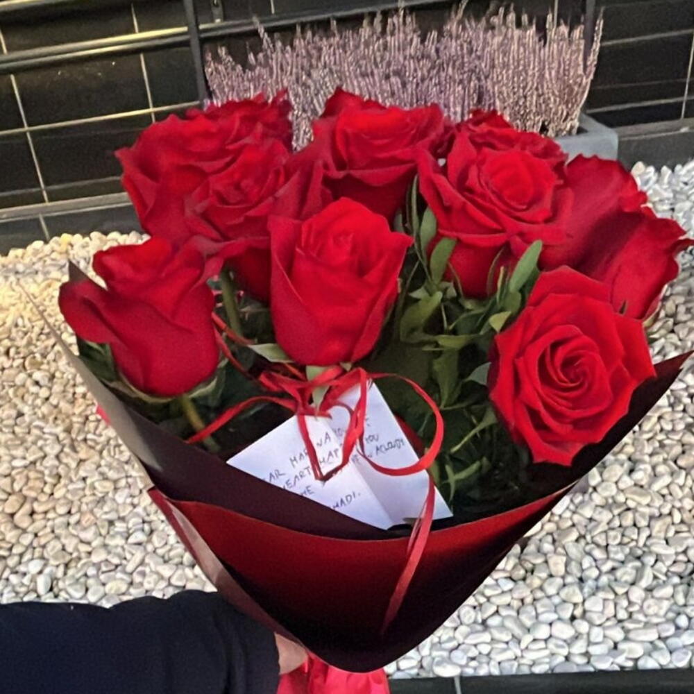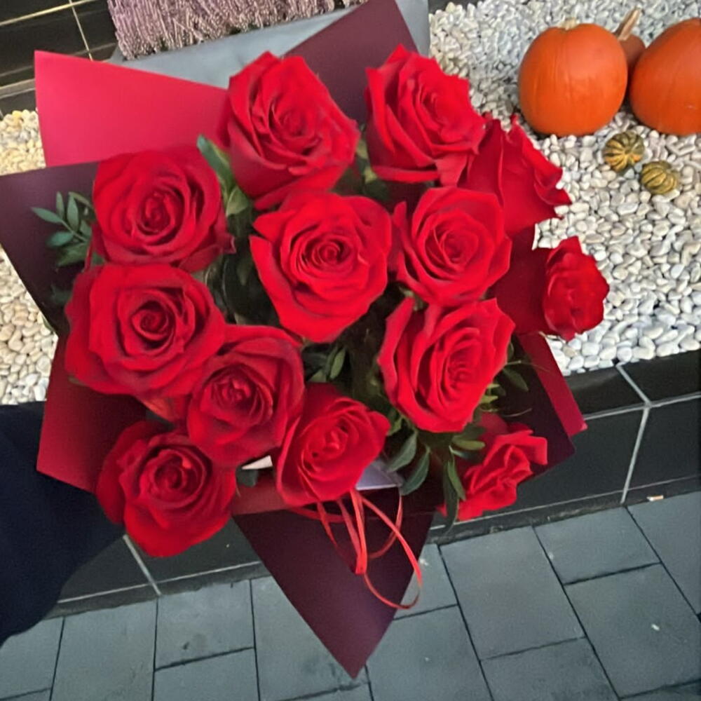 zieleń dekoracyjna - 2 szt. papier dekoracyjny - 1 szt. róże czerwone - 12 szt.
