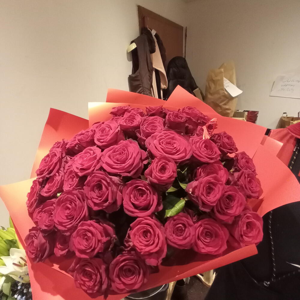 róża czerwona - 41 szt. różowy papier - 2 szt.