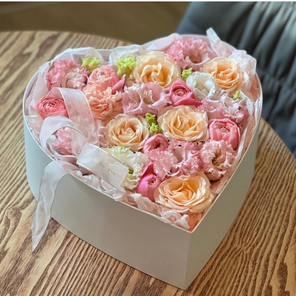 Eustoma - 2 szt. róża gałązkowa - 3 szt. pudełko - 1 szt.