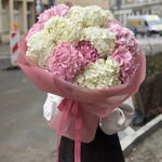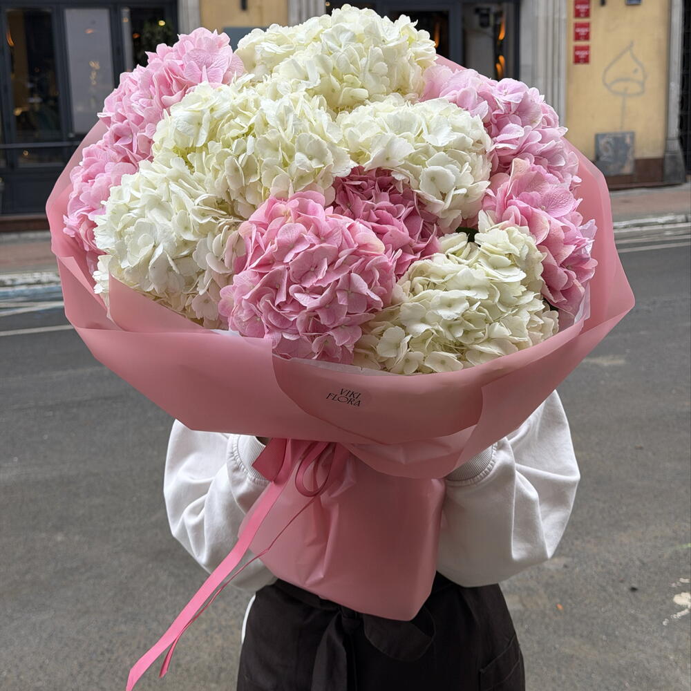 Delikatny, objętościowy bukiet z hortensji w odcieniach pudrowego różu i klasycznej bieli. Lekki, romantyczny i bardzo efektowny — przypomina miękką, słodką chmurkę w wersji mini. Idealny na urodziny, niespodziankę lub jako subtelny gest bez okazji. Na zdjęciu przedstawiono większą wersję bukietu (11 hortensji).