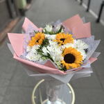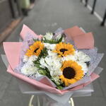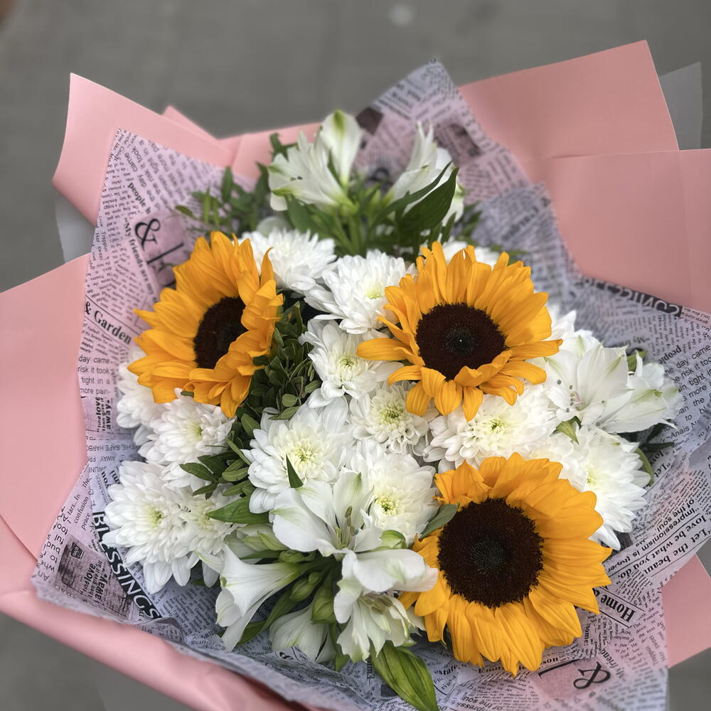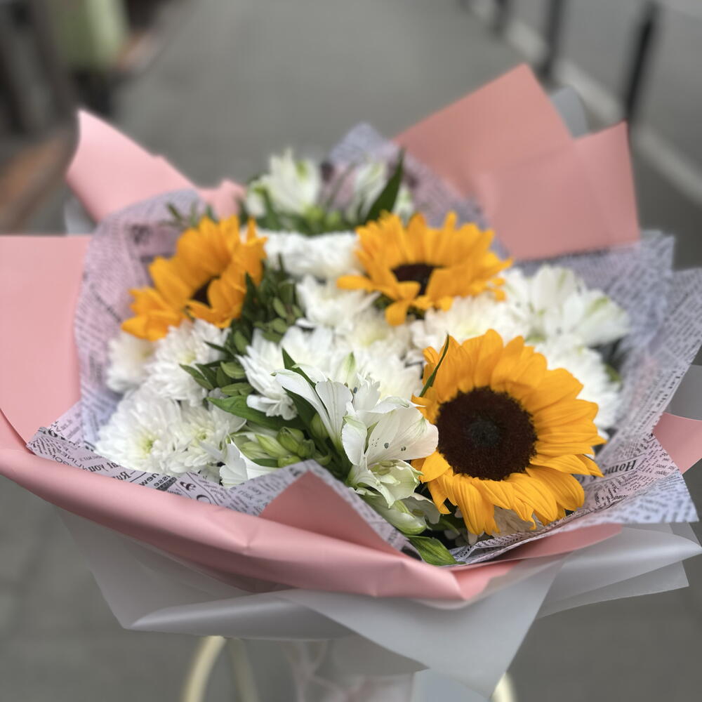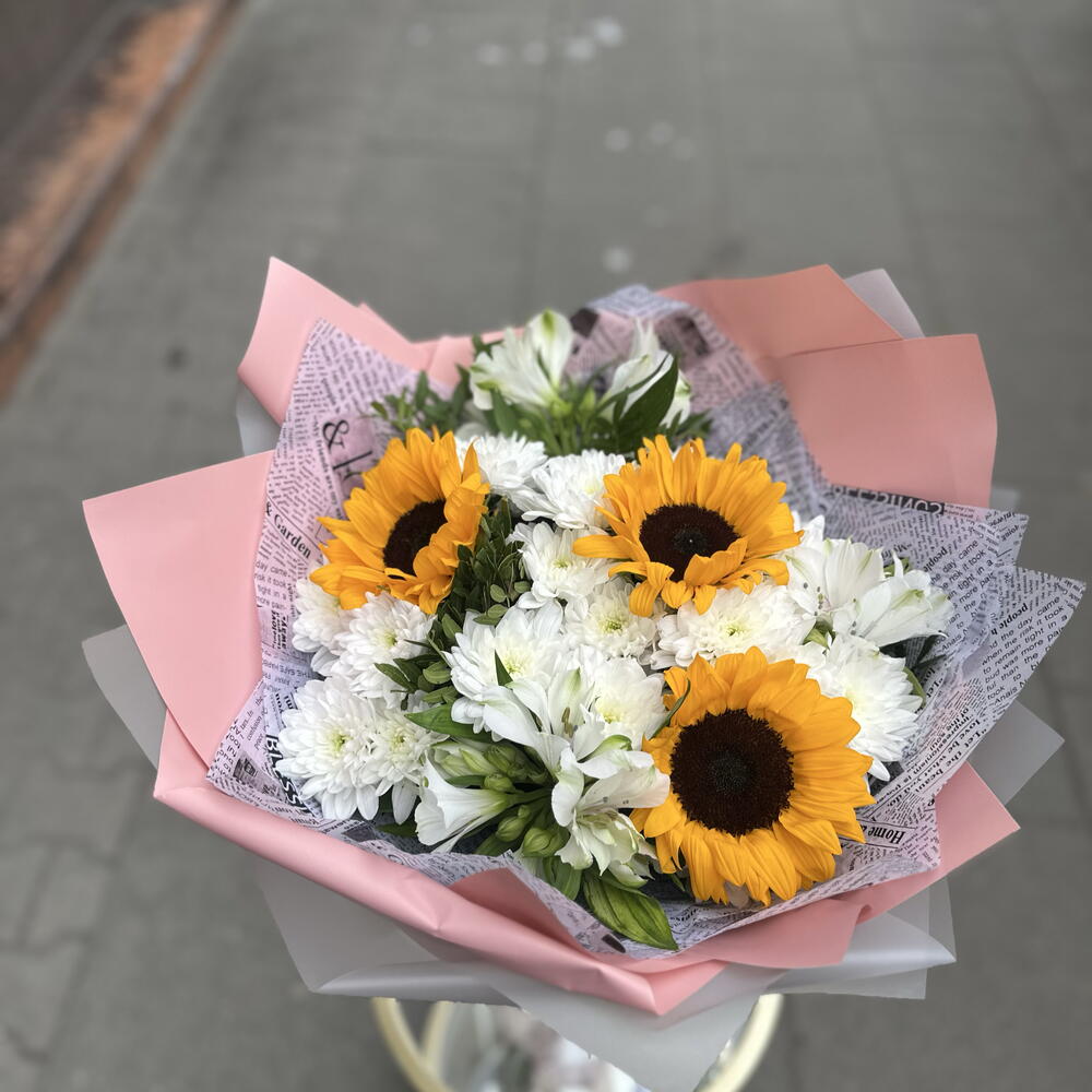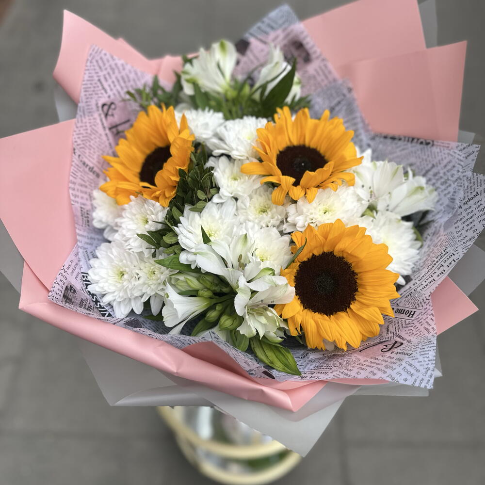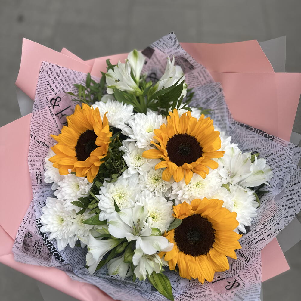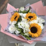 Słonecznik - 3 szt. liście pistacjowe - 10 szt. chryzantemy krzewiaste - 10 szt. mieszanka premium alstroemerii - 4 szt.