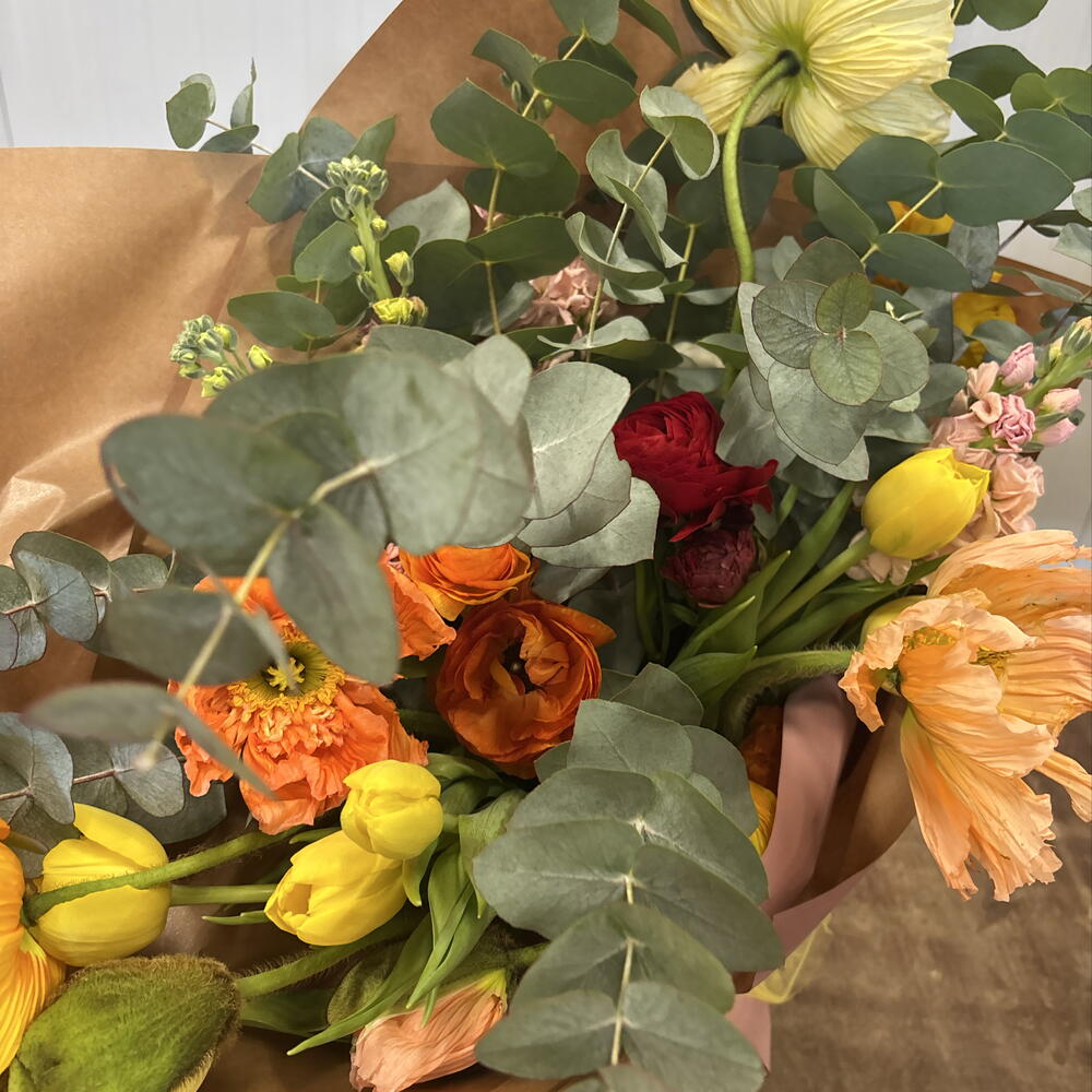 Tulipany - 10 szt. ranunculus - 10 szt. eukaliptus - 7 szt. violaciocche - 5 szt. maki - 10 szt.
