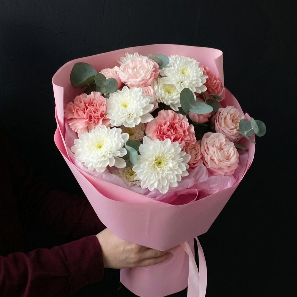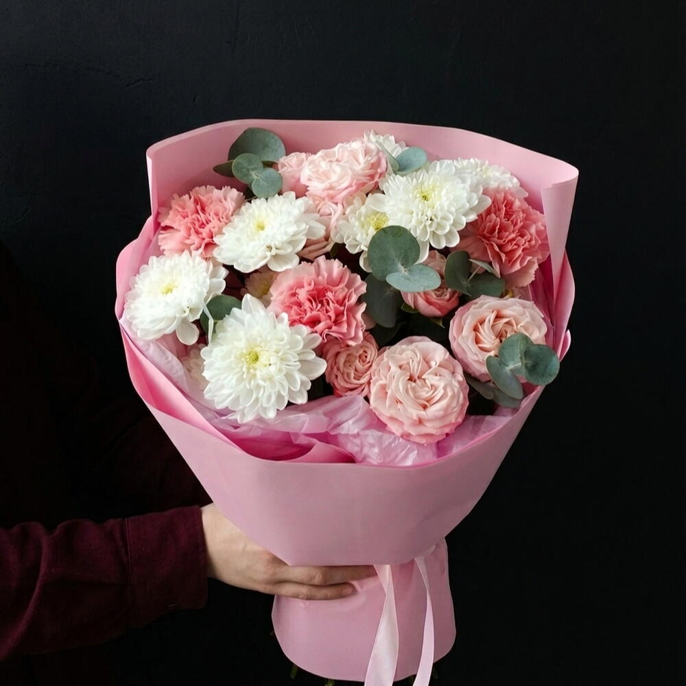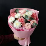 The pure embodiment of tenderness and femininity! This incredibly sweet and elegant bouquet features a beautiful mix of ruffled pink carnations (dianthus), delicate soft pink spray roses, and fluffy white chrysanthemums, beautifully accented with fresh eucalyptus. Wrapped in a stylish matte pink paper, it looks like a soft floral cloud. Because it is based on chrysanthemums and carnations, this bouquet is an absolute champion of longevity and will stay fresh for weeks. A flawless gift for Mother's Day, birthdays, or as a romantic compliment. Tags: Pastel bouquet, Pink carnations, White chrysanthemums, Spray roses, Eucalyptus, Long-lasting flowers, Sweet gift, Mother's day flowers, Pink bouquet. Prawdziwe uosobienie kobiecości i subtelności! Ten uroczy, pastelowy bukiet to mistrzowskie połączenie falbaniastych, różowych goździków (Dianthus), eleganckich jasnoróżowych róż gałązkowych oraz puszystych, śnieżnobiałych chryzantem. Całość idealnie dopełniają listki świeżego eukaliptusa. Zapakowany w modny, matowy papier w pudrowym odcieniu. Dzięki obecności chryzantem i goździków kompozycja ta słynie z rekordowej trwałości w wazonie. Idealny, pełen czułości prezent na Dzień Matki, urodziny lub rocznicę. Tagi: Pastelowy bukiet, Różowe goździki, Białe chryzantemy, Róże gałązkowe, Eukaliptus, Trwałe kwiaty, Prezent dla niej, Dzień Matki, Uroczy bukiet. Воплощение трепетности, женственности и безупречного вкуса! Очаровательный микс в зефирных оттенках: кружевные розовые диантусы (гвоздики), изящные кустовые розочки, пышные белоснежные хризантемы и веточки ароматного эвкалипта. Букет бережно оформлен в стильную матовую упаковку пудрового цвета. Главное преимущество этой композиции — потрясающая стойкость: благодаря хризантемам и диантусам цветы будут радовать получателя очень долго. Идеальный и трогательный подарок для мамы, бабушки, подруги или любимой девушки. Теги: Нежный букет, Пастельный букет, Розовые диантусы, Белые хризантемы, Кустовые розы, Стойкий букет, Эвкалипт, Букет маме, Женственный букет.