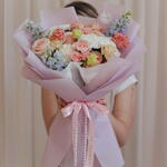white carnations - 2 szt. wrapping paper - 1 szt. delphinium - 3 szt. eustomy - 2 szt. white santini - 2 szt. różowe róże - 3 szt. cluster pink roses - 2 szt. pearl chain - 1 szt.