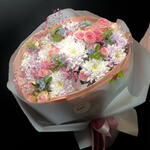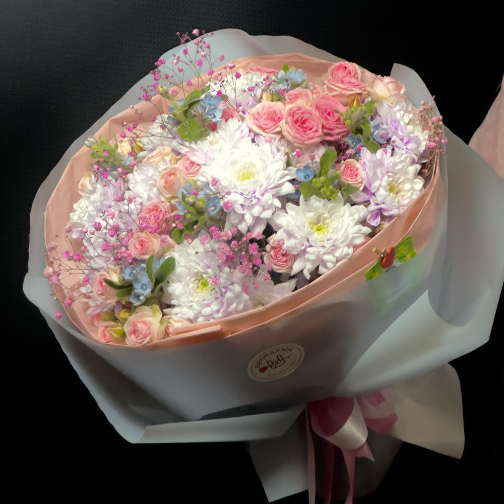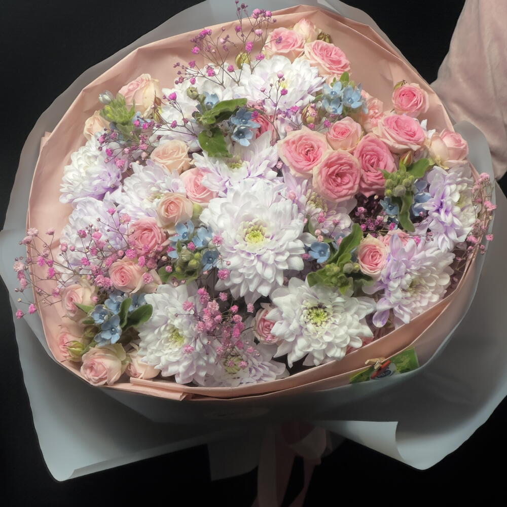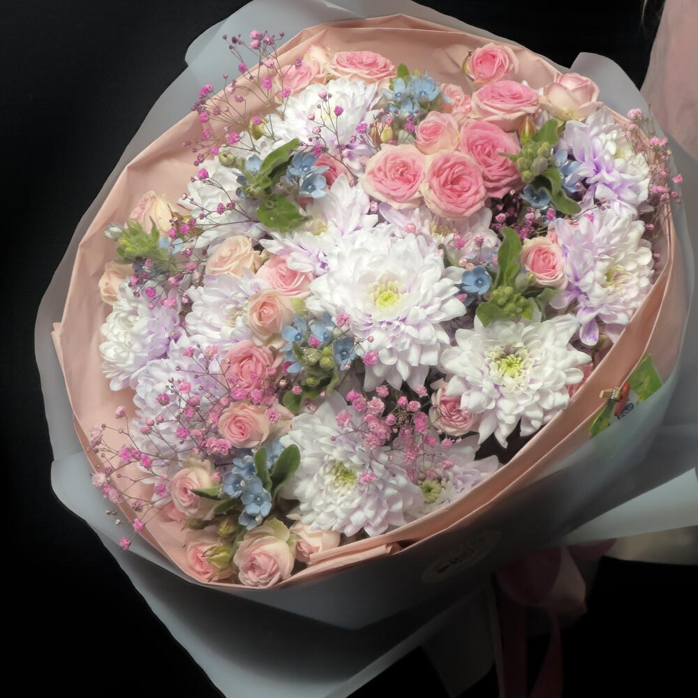 Chryzantema - 4 szt. gipsofila - 3 szt. oxypetalum - 7 szt. róże spray - 5 szt.