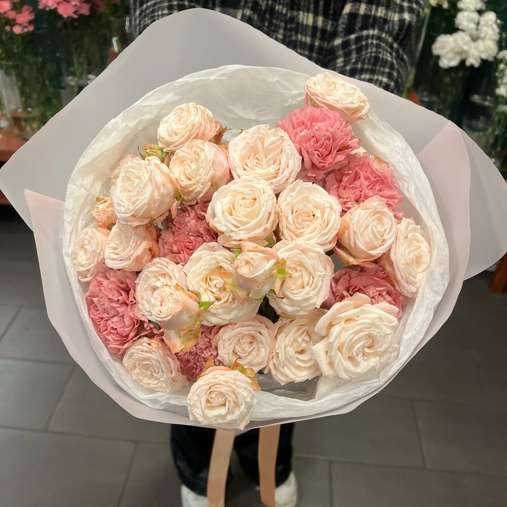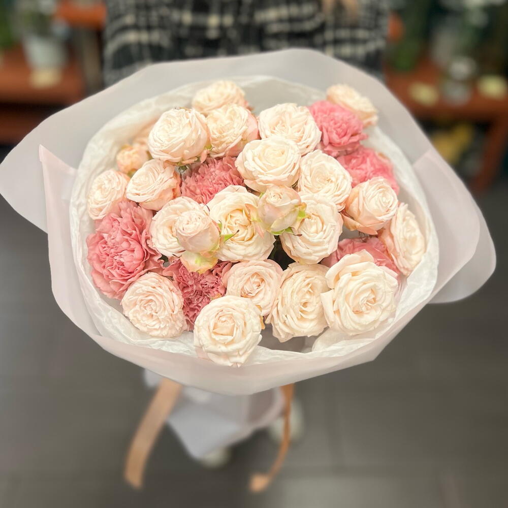 goździk - 6 szt. papier dekoracyjny - 2 szt. wstążka - 1 szt. róża bombastic - 5 szt. papier de soie - 2 szt.